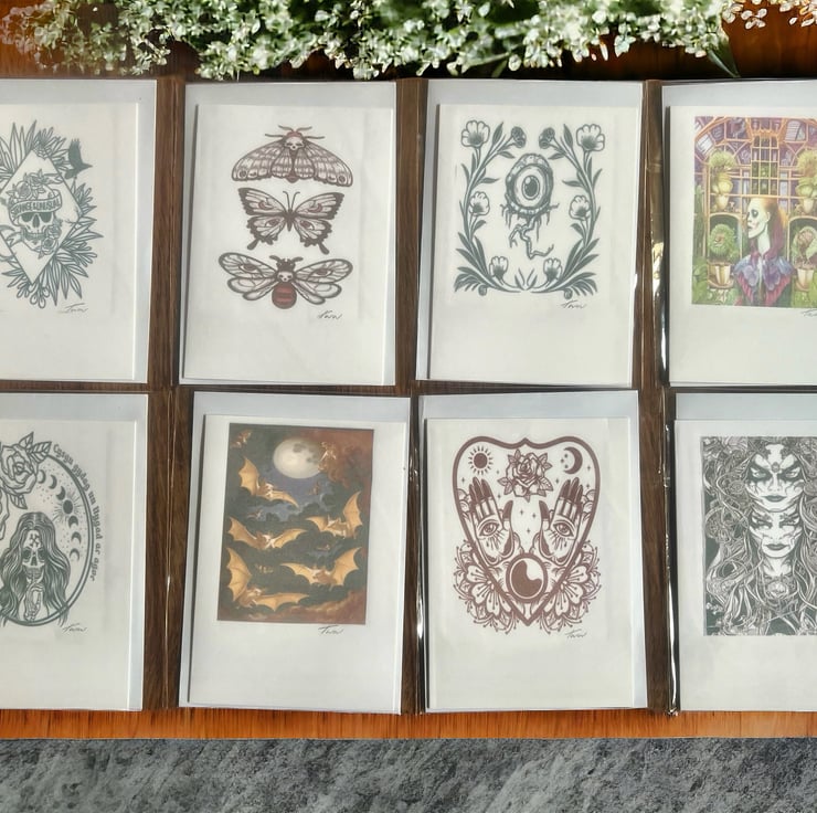 Pack of 8 assorted gothic/alternative small blank cards.
