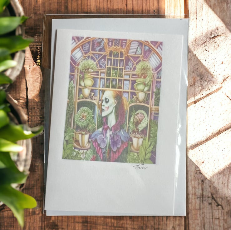 Small blank card with zombie in a greenhouse design.