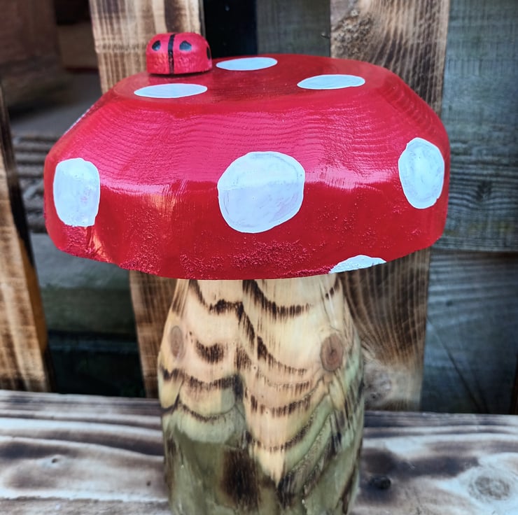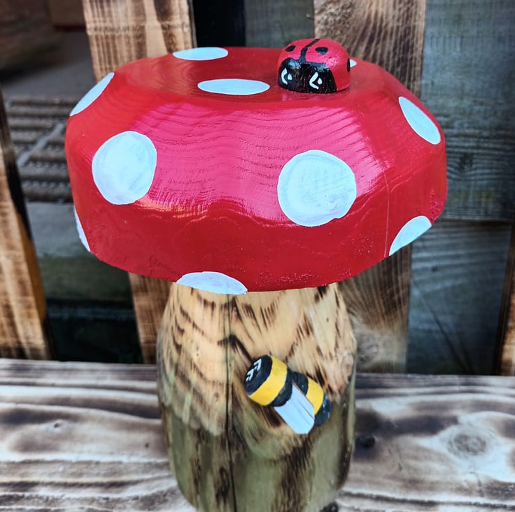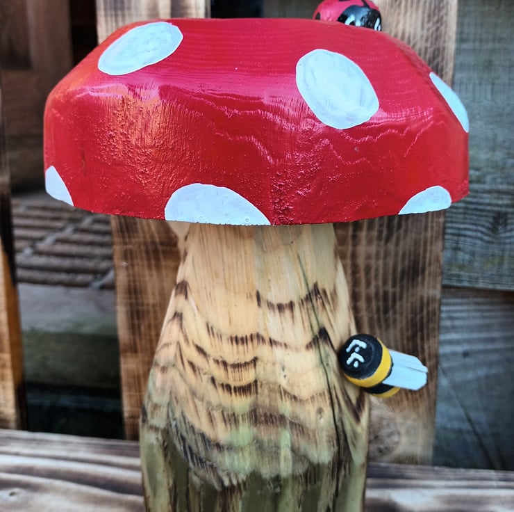 It is made of two pieces of wood securely attached together and has been chainsaw carved then sanded. The spotty top is decorated with weatherproof red and white paints. The little ladybird and bee are also handmade from offcuts of hazel.