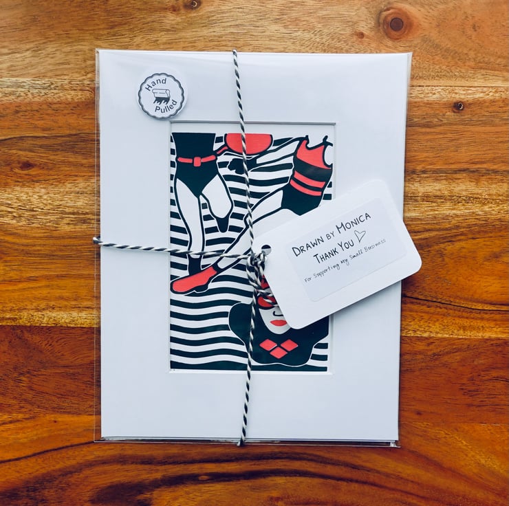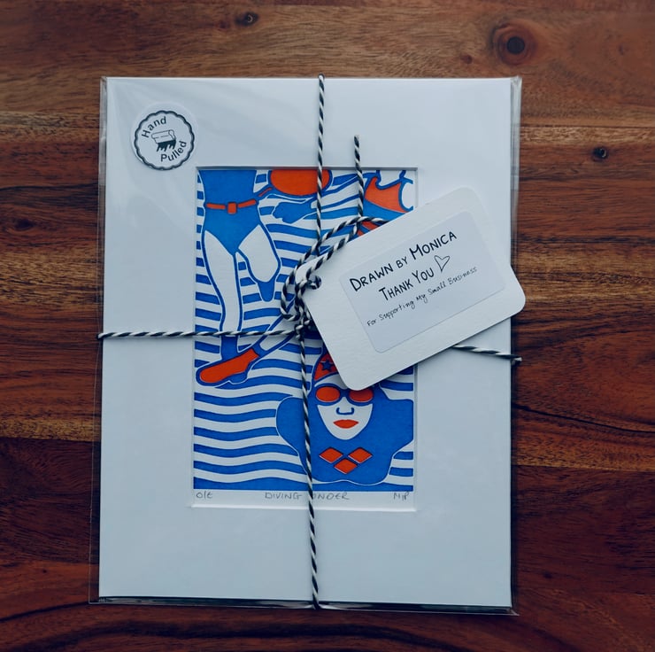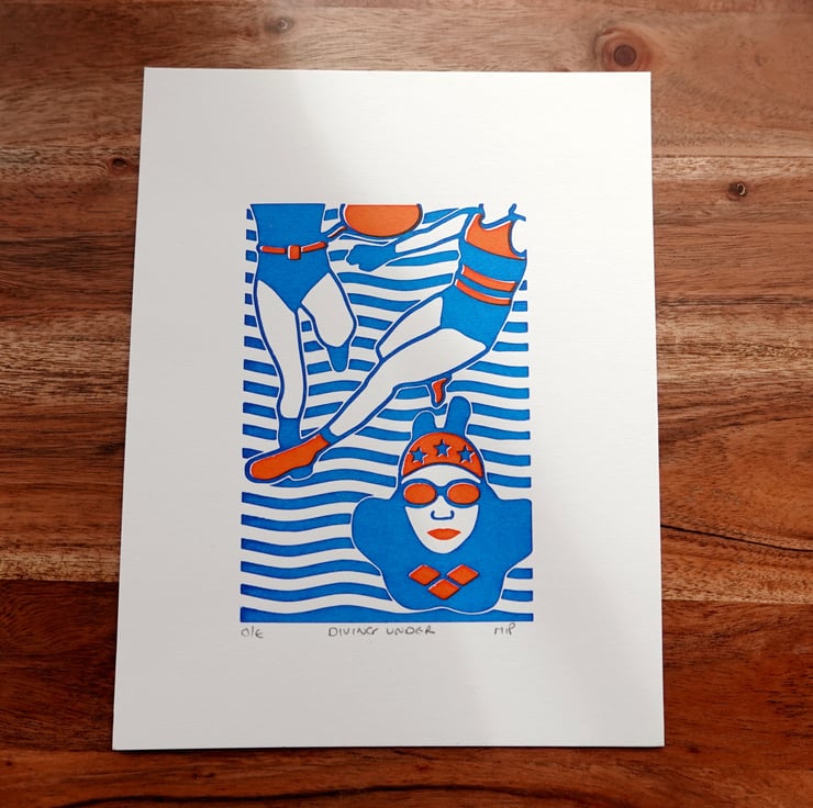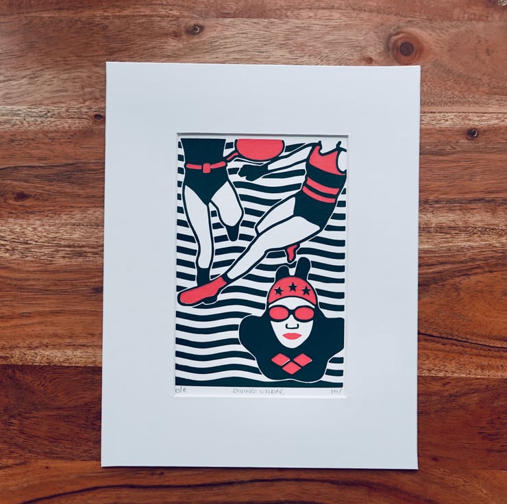 Celebrate the quiet magic of a swimmer’s moment beneath the surface with "Diving Under", a bold handprinted screen print, created from my artwork using vinyl stencils.