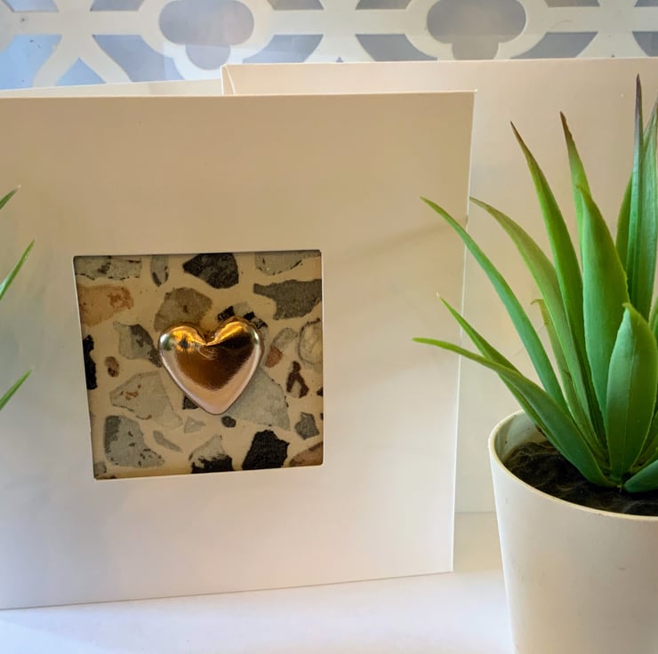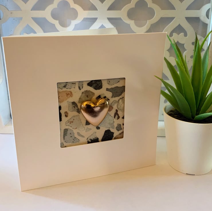 A beautiful rose gold heart embellishment is the focal point on a pebble pattern background which has been decoupaged using fine rice paper with a suttle hint of sparkle.