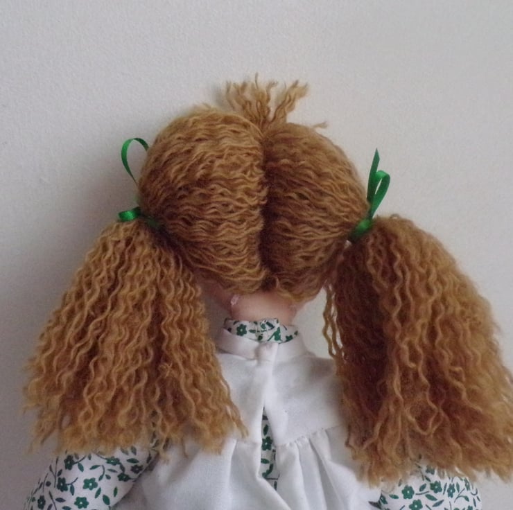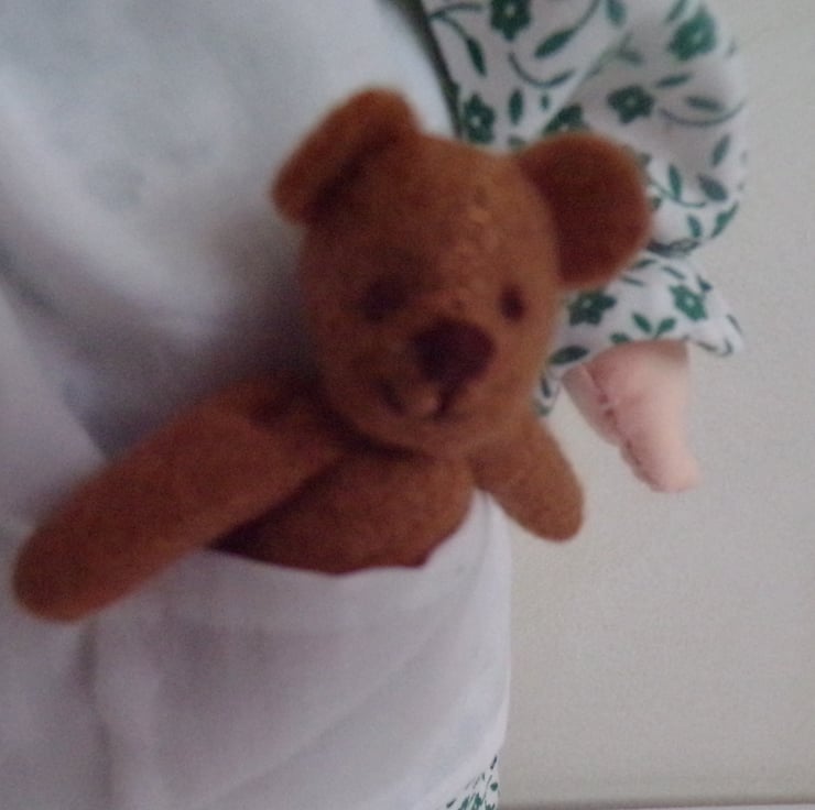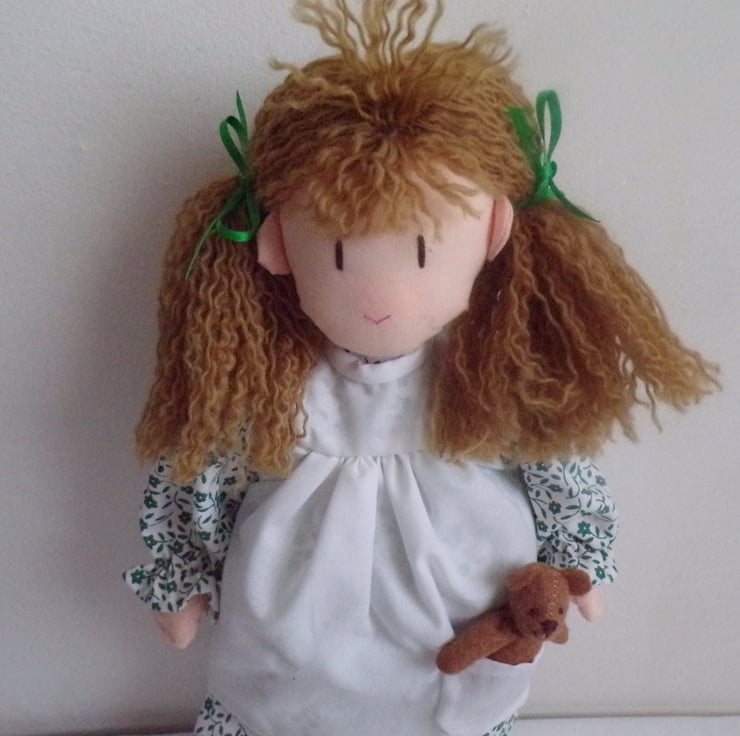 Annabel is a beautiful 14 inch rag doll, perfect size for little arms to cuddle. She comes to you in a removable dress and apron, with fixed bloomers on under the dress, little black shoes and green ribbons in her hair. She carries a little teddy bear in her pocket made from felt. Annabel is filled with polyester filling. A handstitched doll, made with love. Annabel would make a lovely forever friend for the little (or big) person in your life.