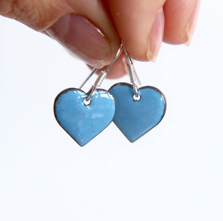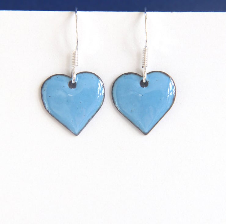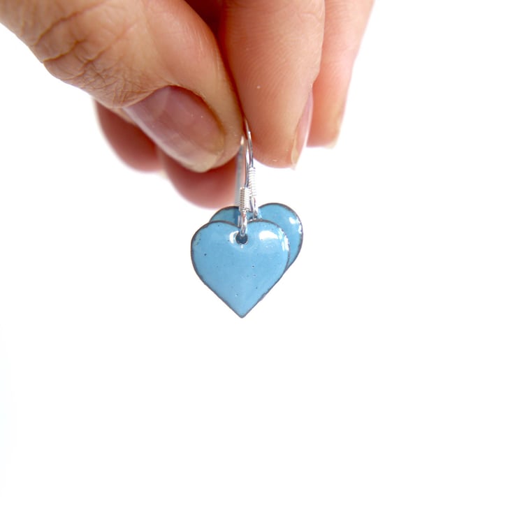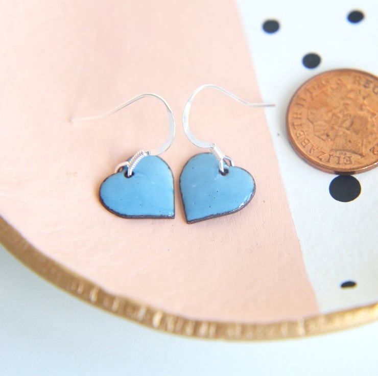 Cute baby blue heart earrings handmade with enamel on copper. They measure approximately 13mm in diameter and are fired using soft blue enamel which creates a subtle glazed finish.
