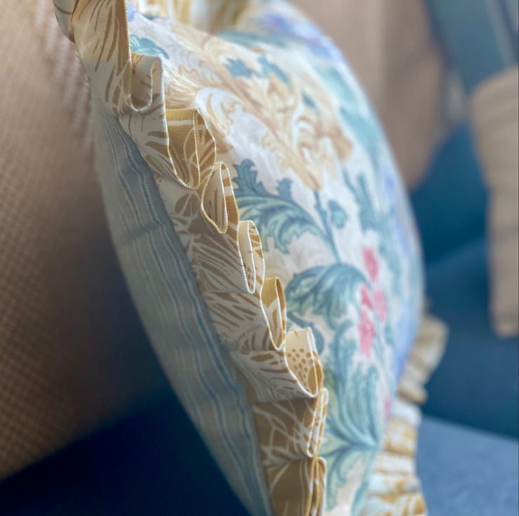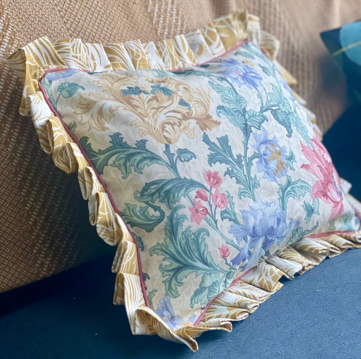 My inspiration came from the fabulous remnant of vintage floral fabric I was gifted and the result a couple of stunning floral ruffle trim cushion covers.