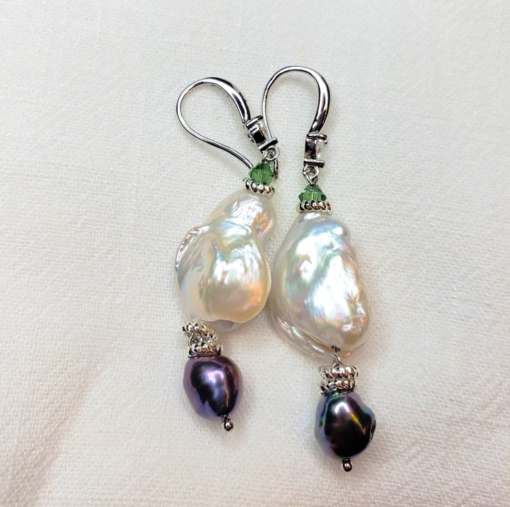 The earrings are made of irregular shaped big (20mm) freshwater pearls and coloured pearls . Silver plated findings were used. Earring complemented with Swarovski crystals