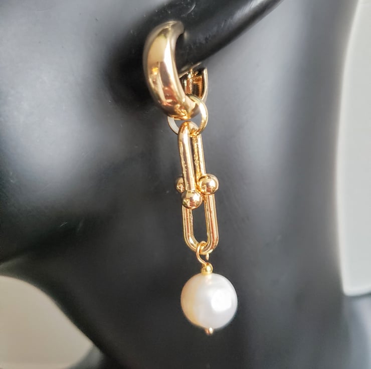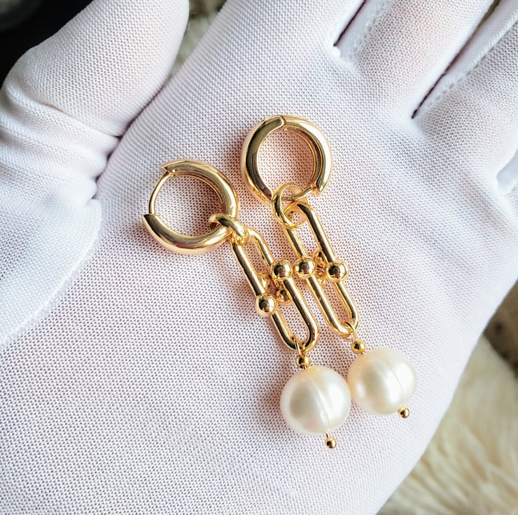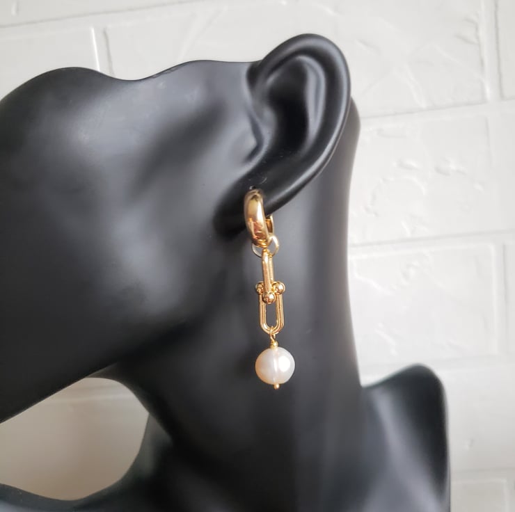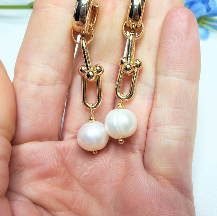 18K Gold Plated U-shaped Horseshoe Chunky Chain Freshwater Pearl Drop Earrings