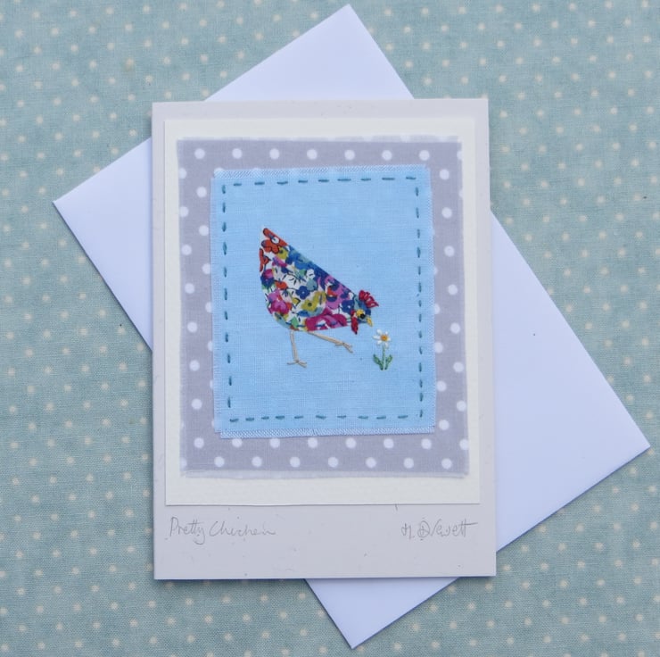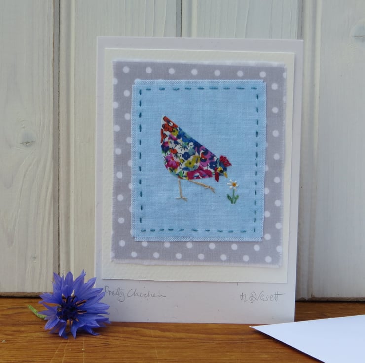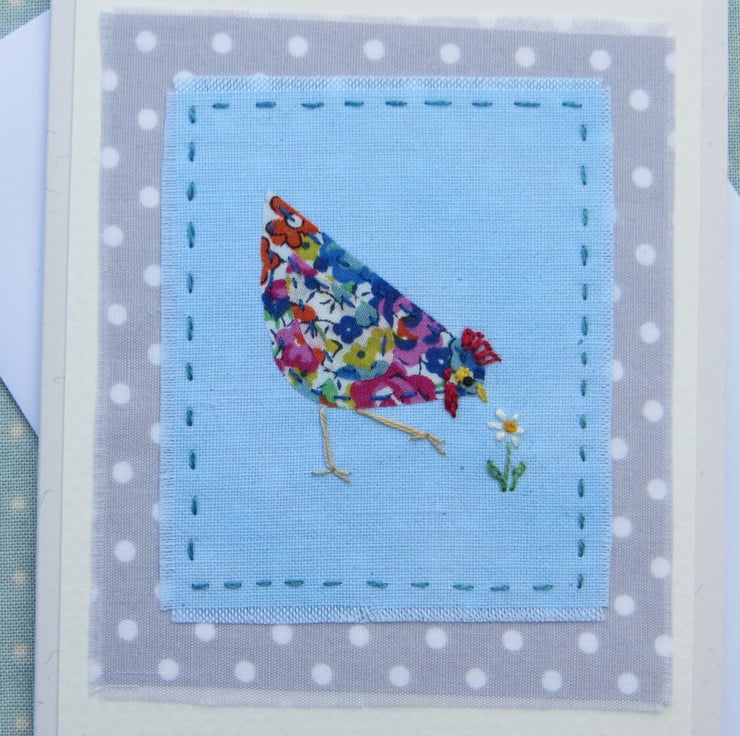 This is a hand-stitched miniature textile, mounted onto greeting card - a gift in itself to keep (and frame?) as well as a card in which to write your message, perfect for the new poultry keeper! The little hen is cut from beautiful Liberty Tana Lawn fabric.