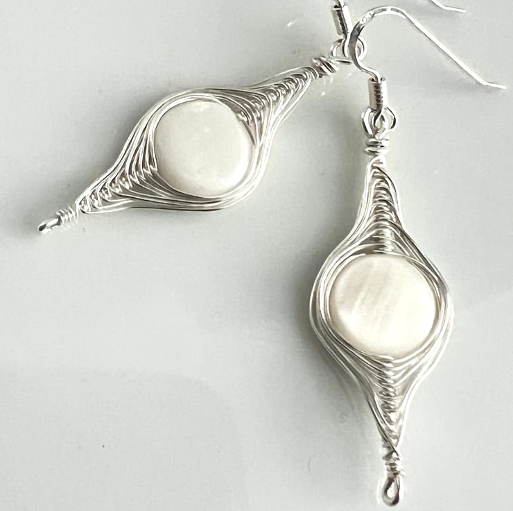 White Coin Mother Of Pearls are framed in a woven web of wire strands to create these sophisticated dangle earrings. Lightweight to wear, a beautiful design that would be suitable for weddings, bridesmaids to birthday celebrations.