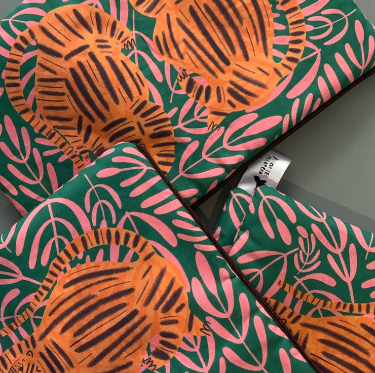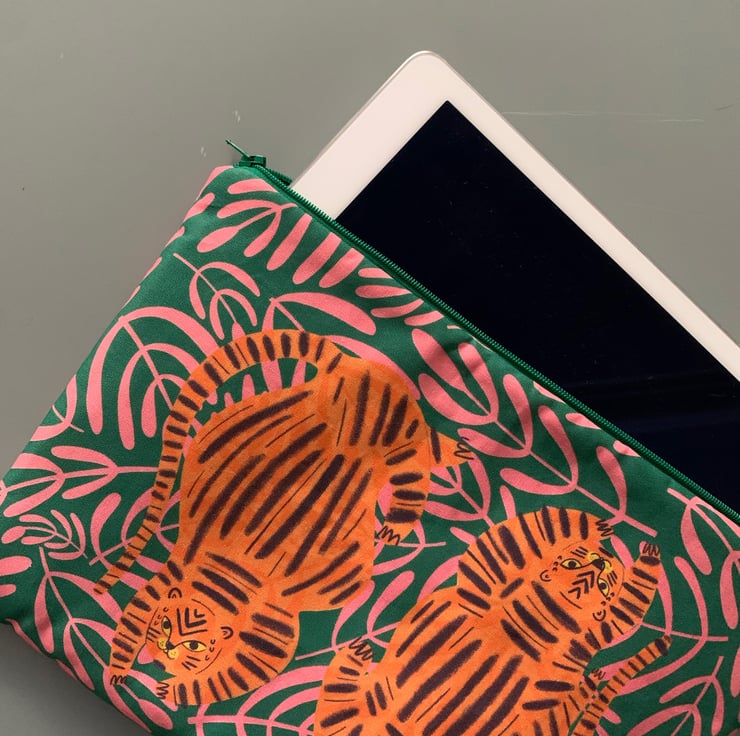 A padded large pouch, made from my best selling illustrated tiger and jungle leaf fabric.