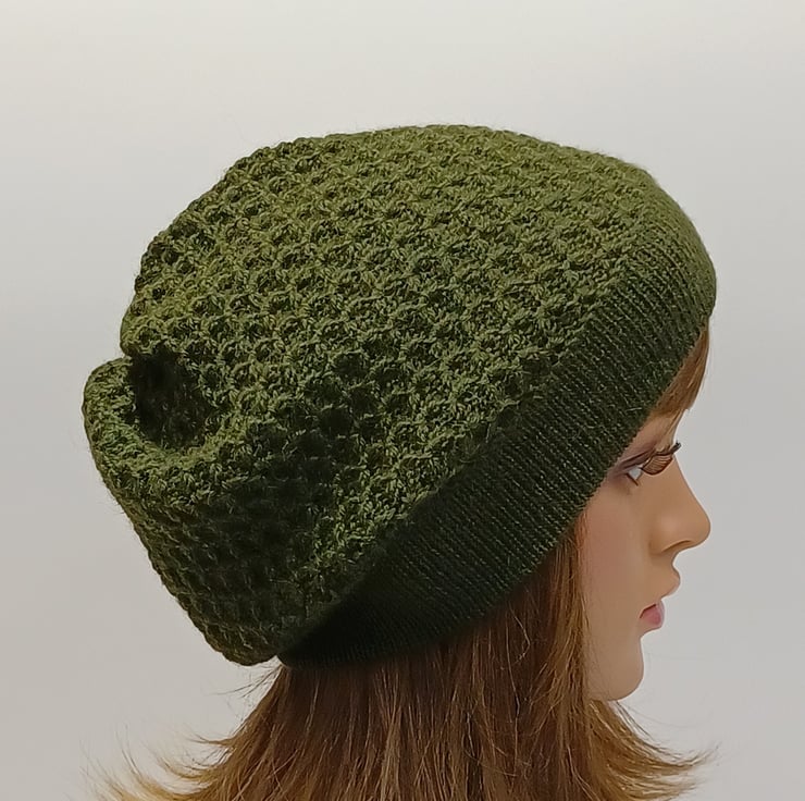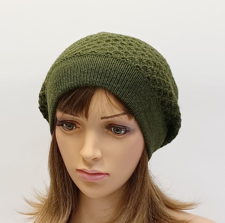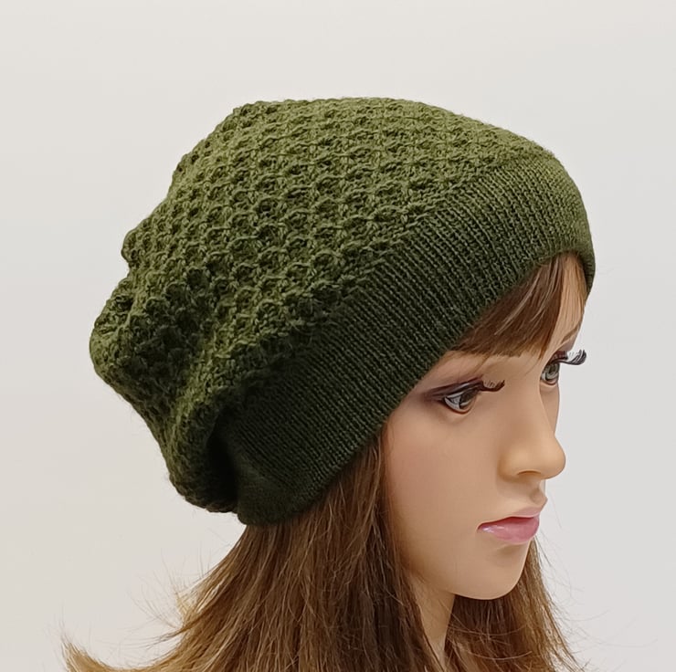 Khaki green alpaca beret for women, knitted baggy beanie, elegant tam, handmade hat.