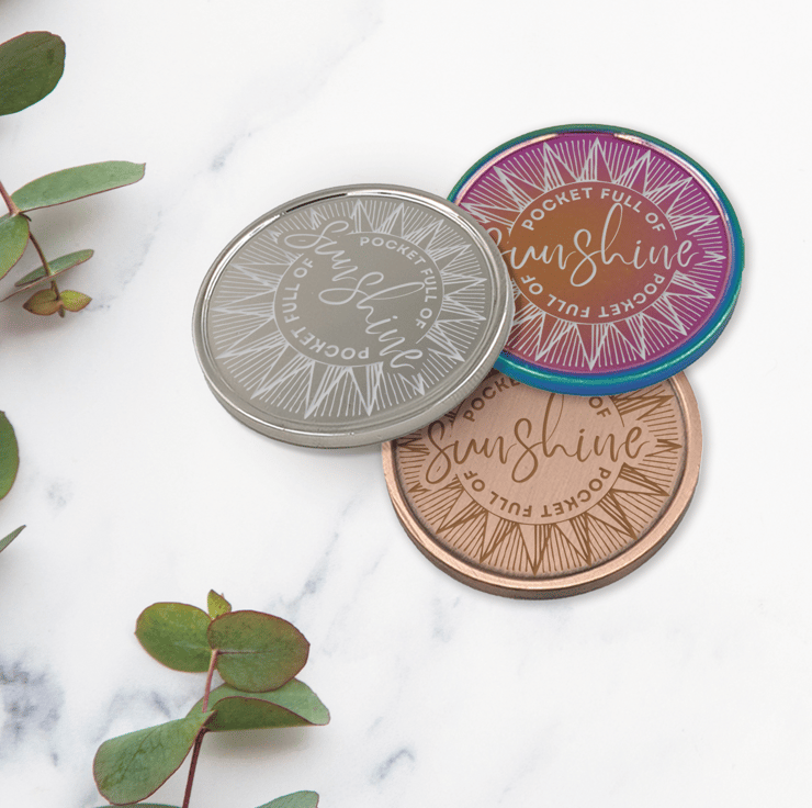 Carry a little sunshine with you wherever you go with our "Pocket Full of Sunshine" Engraved Metal Coin. This adorable and thoughtful gift is available in a range of different metals, adding a touch of warmth to your pocket.