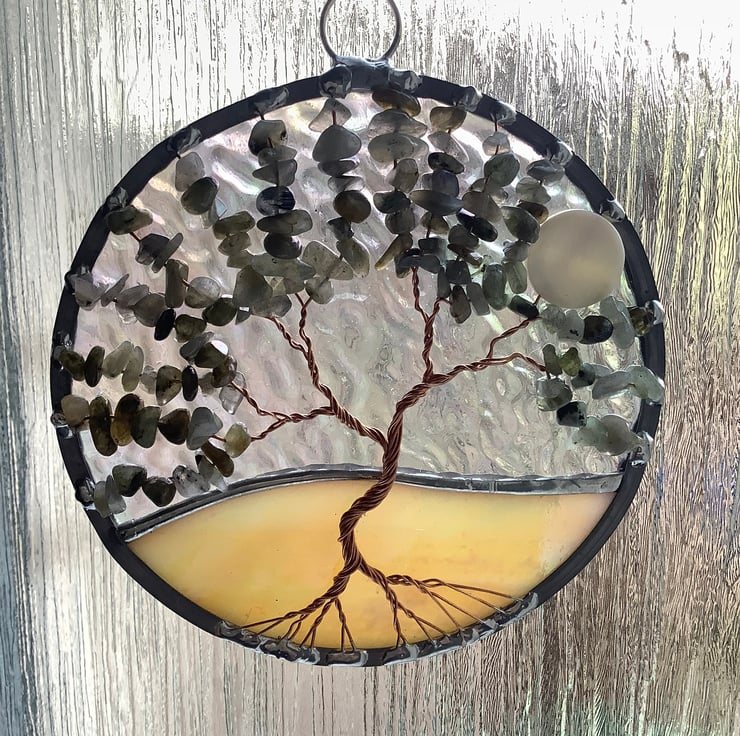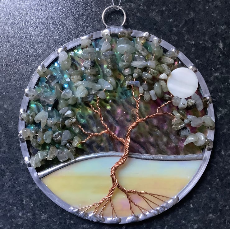 The background has has an irridised clear glass with an irridised caramel mix glass base that have been foiled and soldered together . There is a twisted copper wire tree with branches filled with tumbled labradorite gemchips and the panel is edged with a traditional lead came channel. There is also a shell bead 'moon' shining through the branches.