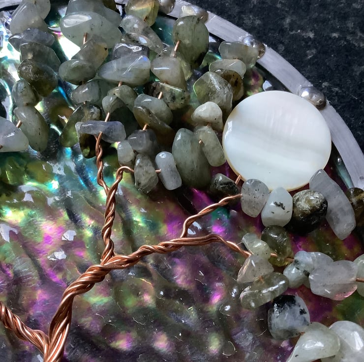 A labradorite tree of life decoration that works as a suncatcher or wall hanging.
