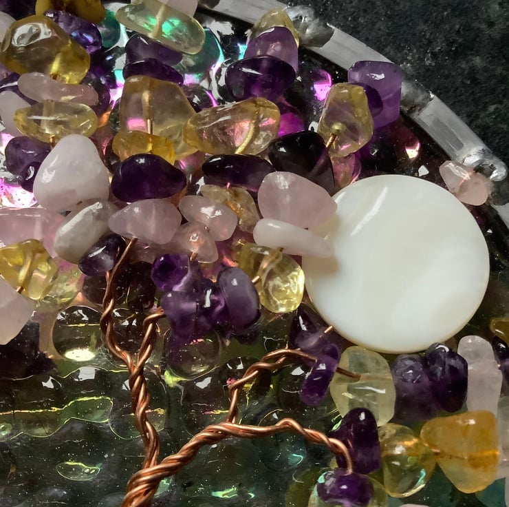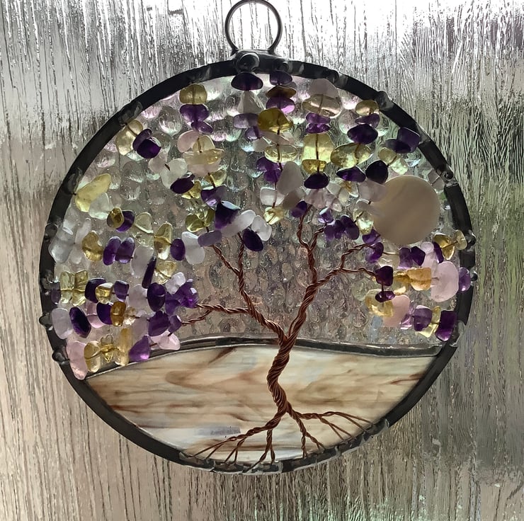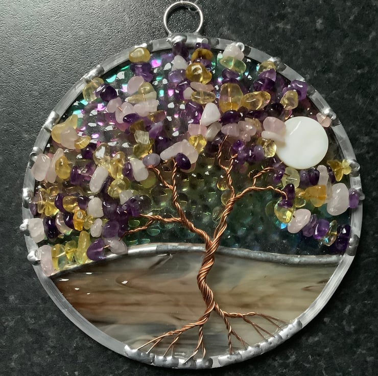 The background has an irridised textured clear background glass with a streaky brown and white mix base that have been foiled and soldered together . There is a twisted copper wire tree with branches filled with tumbled amethyst,rose quartz and citrine gemchips and the panel is edged with a traditional lead came channel. There is also a shell bead 'moon' shining through the branches.