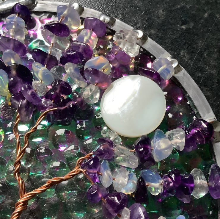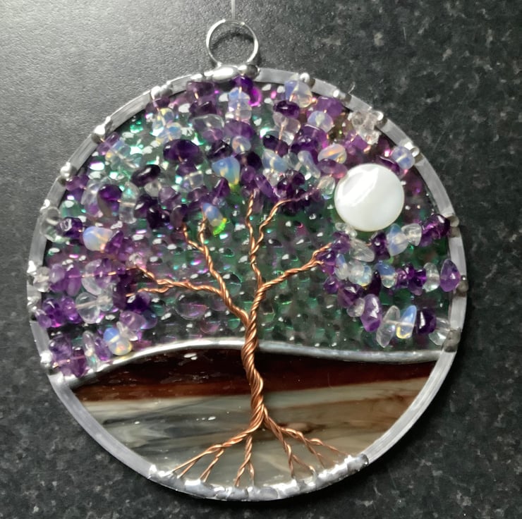 The background has an irridised textured clear glass with a wispy brownwhite mix base that have been foiled and soldered together . There is a twisted copper wire tree with branches filled with tumbled amethyst gemchips and opalite glass chips and the panel is edged with a traditional lead came channel. There is also a shell bead 'moon' shining through the branches.