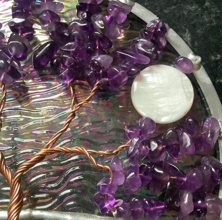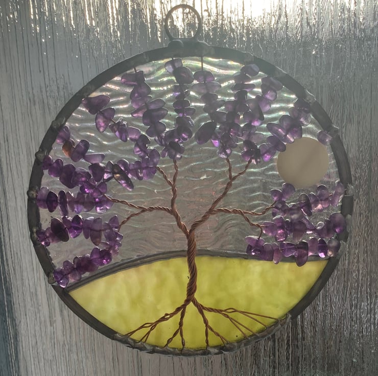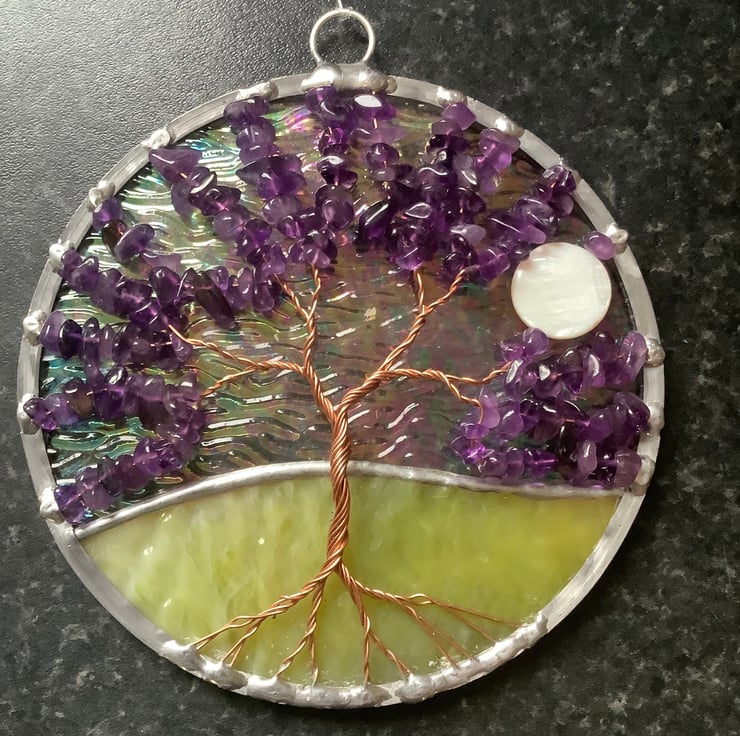 The background has an irridised and textured clear glass with an avocado green base that have been foiled and soldered together . There is a twisted copper wire tree with branches filled with tumbled amethyst gemchips and the panel is edged with a traditional lead came channel. There is also a shell bead 'moon' shining through the branches.