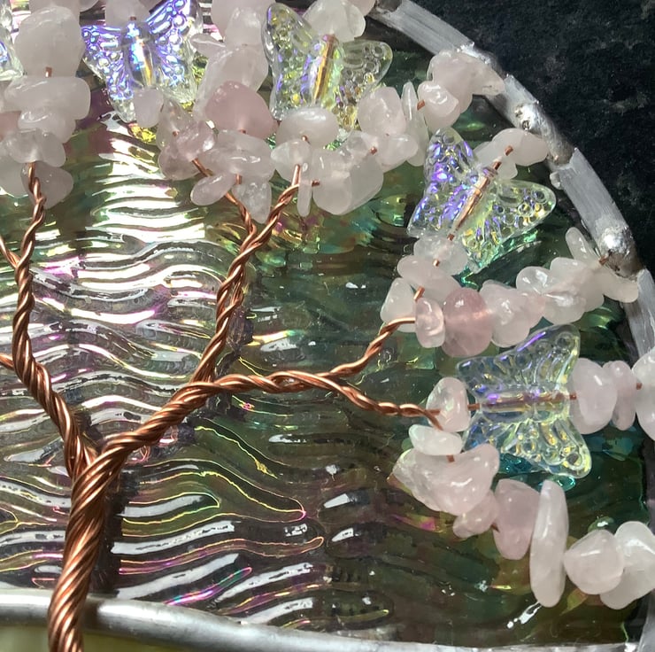 A rose quartz and butterfly tree of life decoration that works as a suncatcher or wall hanging.