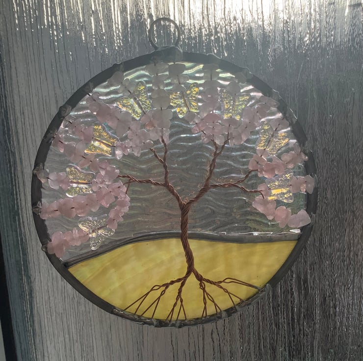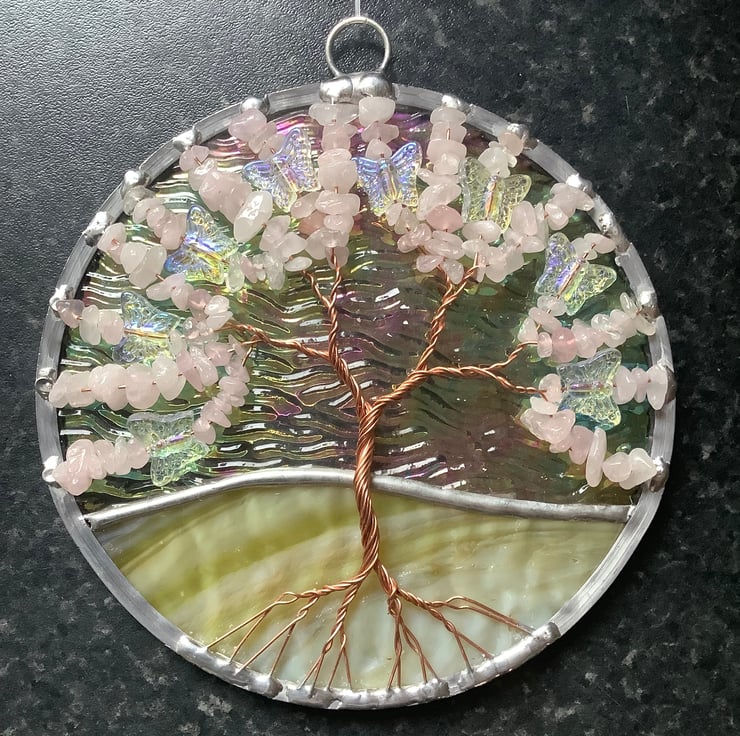 The background has a clear irridised glass with an avocado mix base that have been foiled and soldered together . There is a twisted copper wire tree with branches filled with tumbled rose quartz gemchips plus clear crystal butterflies and the panel is edged with a traditional lead came channel.