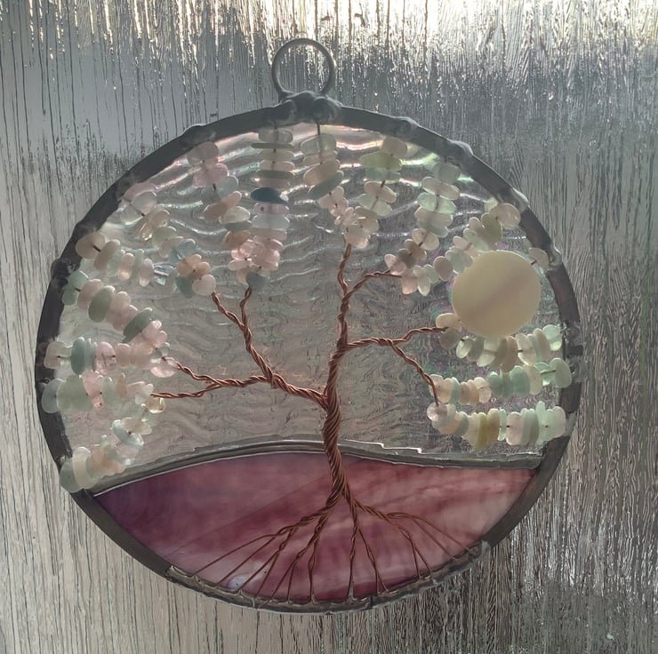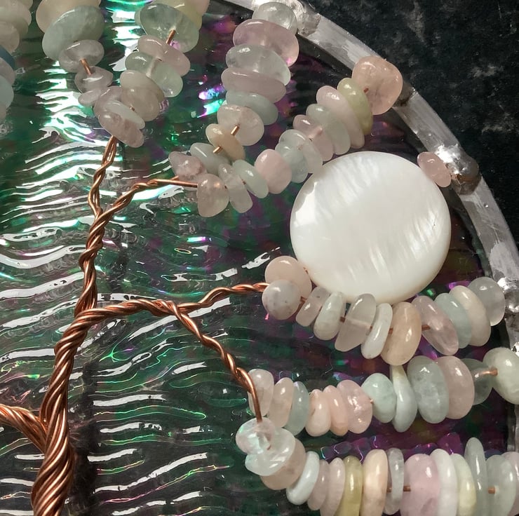 The background has an irridised textured clear glass with a purpleblue mix base that have been foiled and soldered together . There is a twisted copper wire tree with branches filled with tumbled morganite gemchips and the panel is edged with a traditional lead came channel. There is also a shell bead 'moon' shining through the branches.
