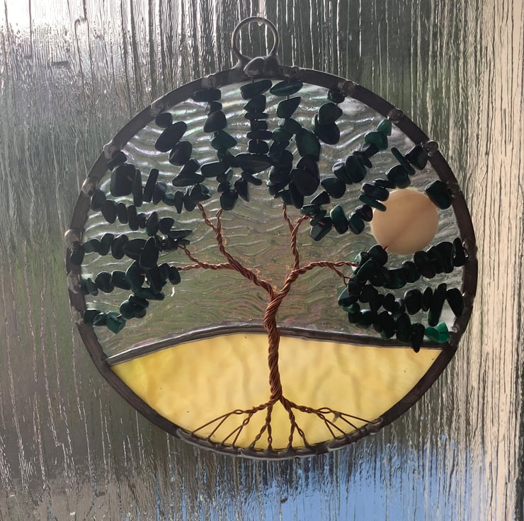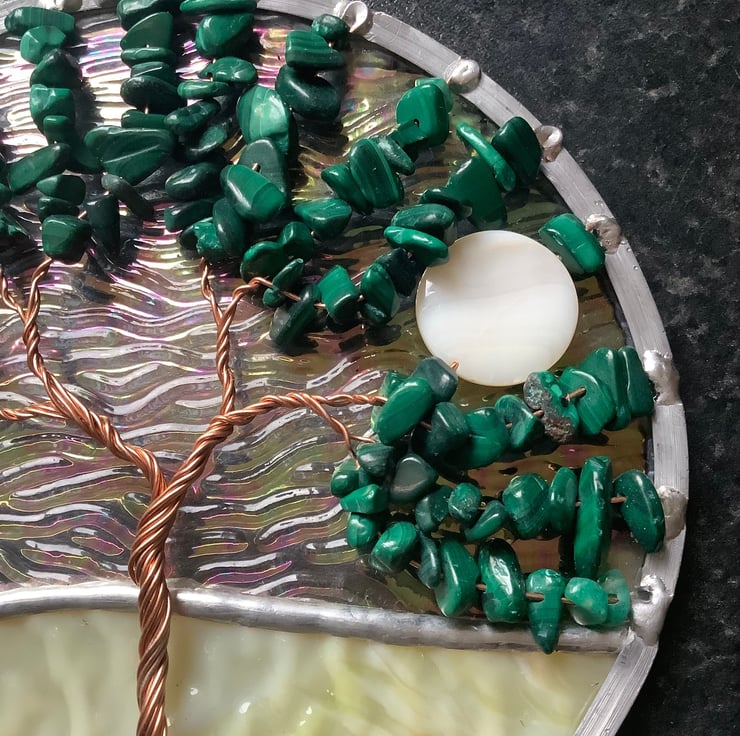 The background has an irridised and textured clear glass with an avocado green base that have been foiled and soldered together . There is a twisted copper wire tree with branches filled with tumbled genuine malachite gemchips and the panel is edged with a traditional lead came channel. There is also a shell bead 'moon' shining through the branches.