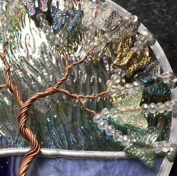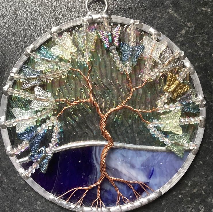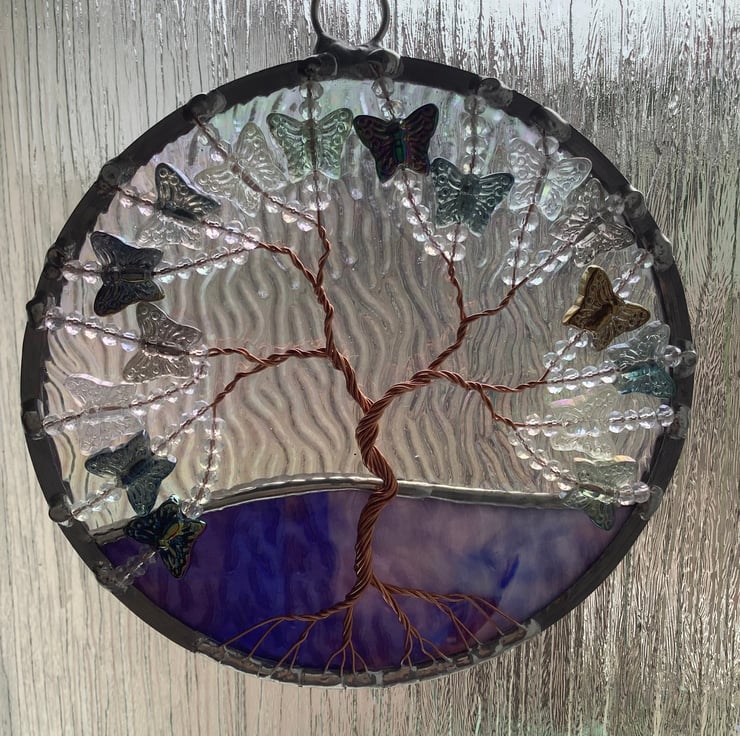 The background has an irridised clear glass with a streaky blue and purple mix base that have been foiled and soldered together . There is a twisted copper wire tree with branches filled with sixteen pressed glass butterfly beads and the panel is edged with a traditional lead came channel.