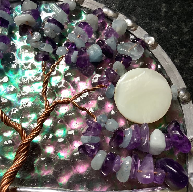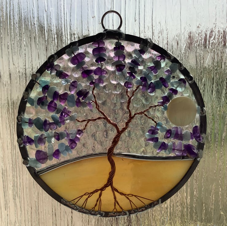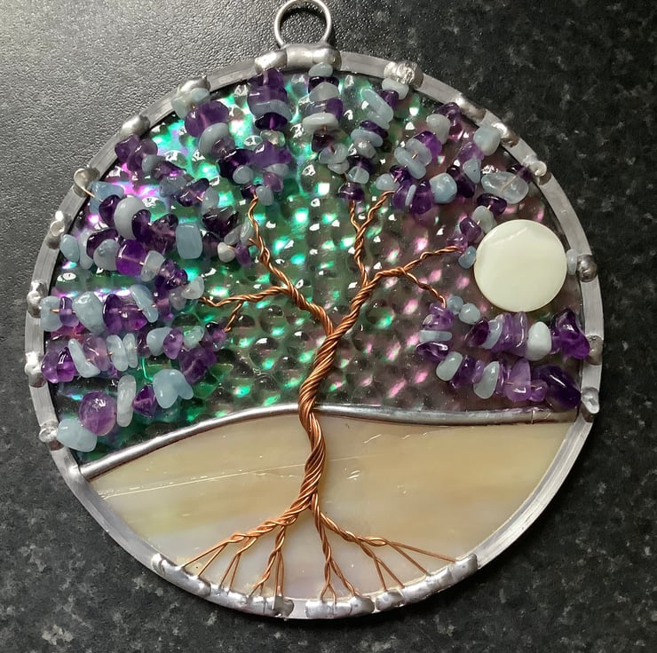 The background has an irridised textured clear background glass with a streaky cream and white mix base that have been foiled and soldered together . There is a twisted copper wire tree with branches filled with tumbled amethyst and aquamarine gemchips and the panel is edged with a traditional lead came channel. There is also a shell bead 'moon' shining through the branches.