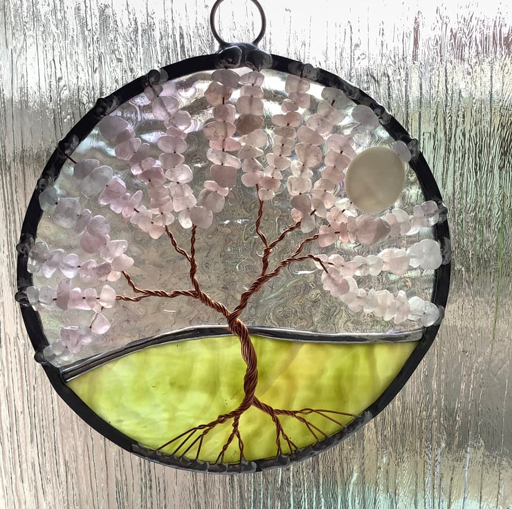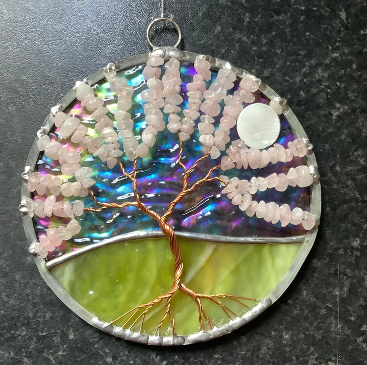 The background has an irridised textured clear glass with a rippled avocado green base that have been foiled and soldered together . There is a twisted copper wire tree with branches filled with tumbled rose quartz gemchips and the panel is edged with a traditional lead came channel. There is also a shell bead 'moon' shining through the branches.