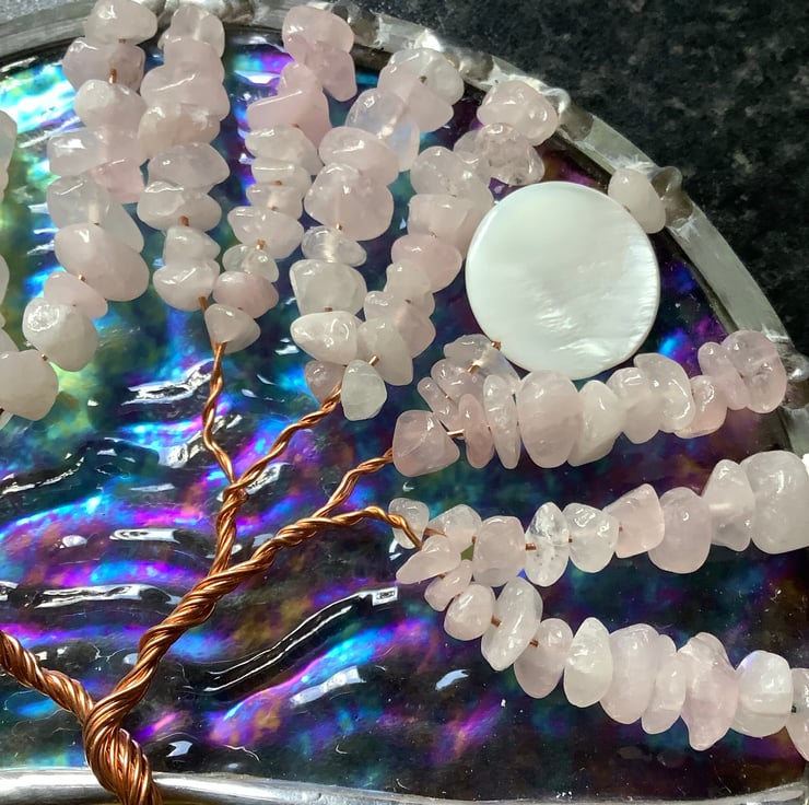 A rose quartz tree of life decoration that works as a suncatcher or wall hanging.