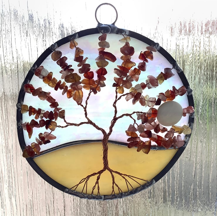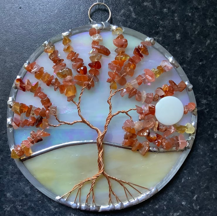 The background has an irridised wispy white glass with a caramel glass base that have been foiled and soldered together . There is a twisted copper wire tree with branches filled with tumbled carnelian gemchips and the panel is edged with a traditional lead came channel. There is also a shell bead 'moon' shining through the branches.