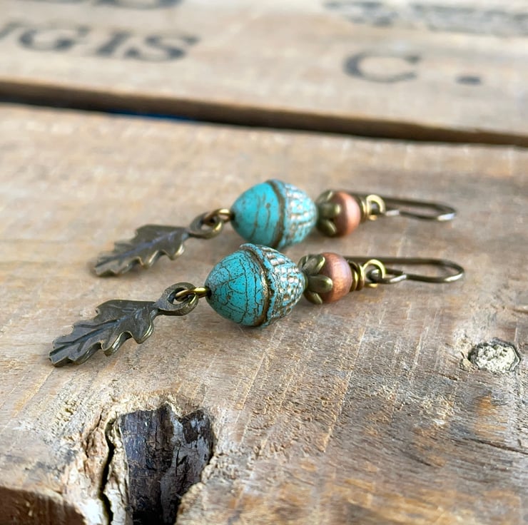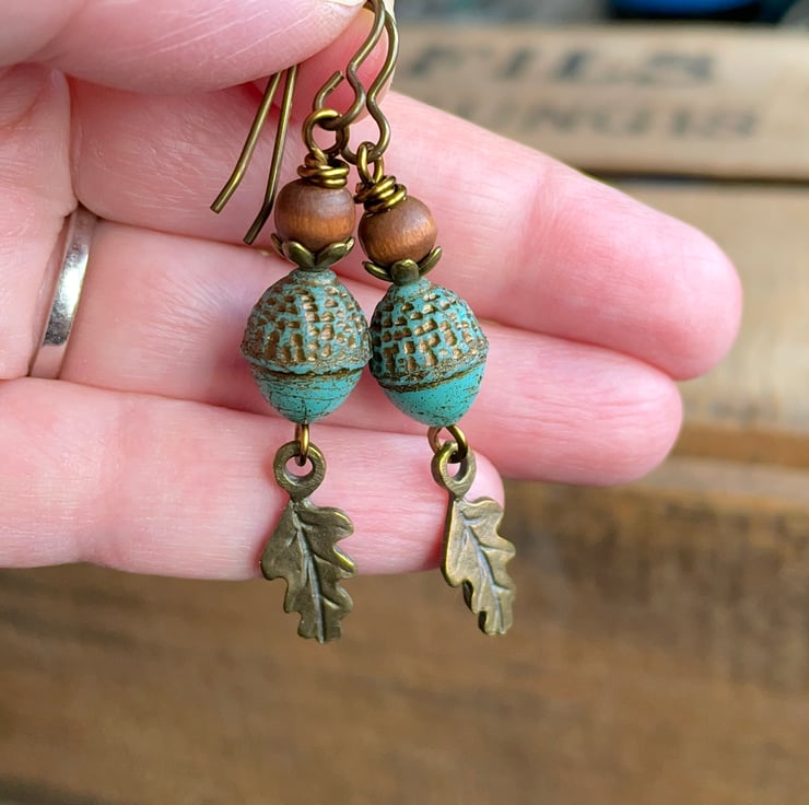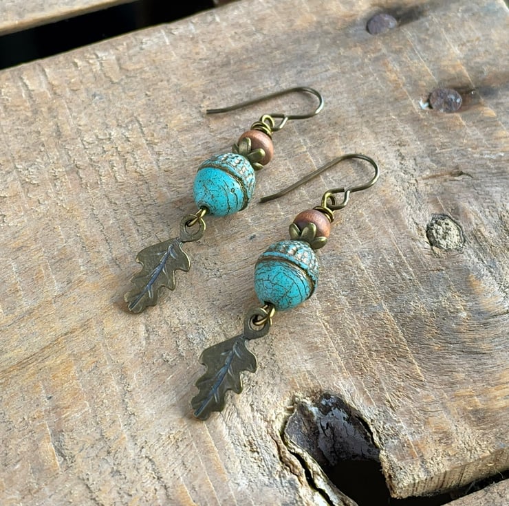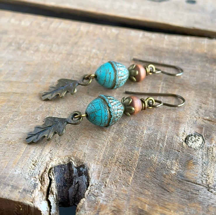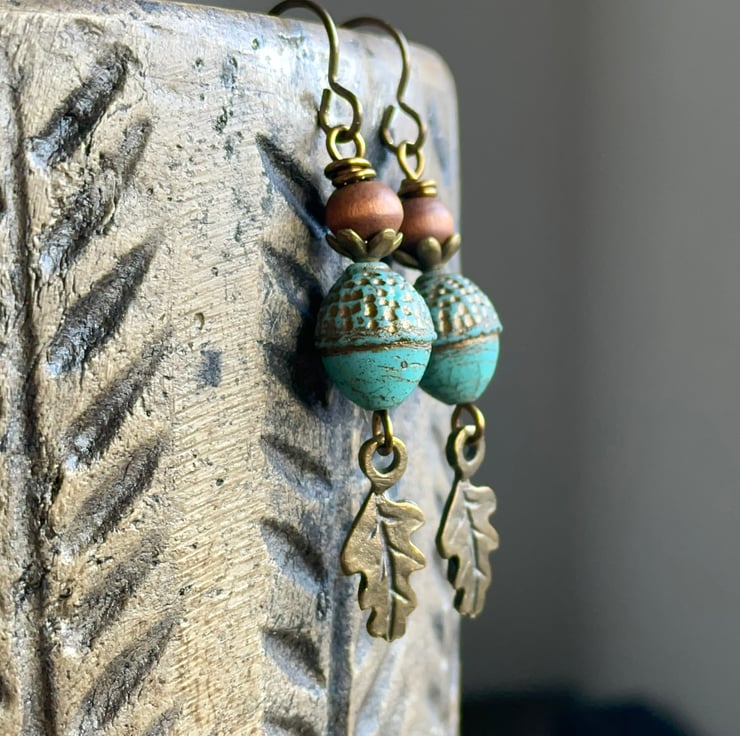 These nature-inspired earrings feature beautifully detailed Czech glass acorn beads. These rustic beads are made with opaque turquoise glass, finished with a dark bronze wash.