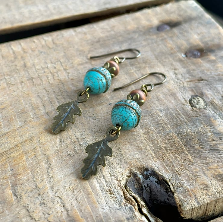 The earrings are finished with Greek cast metal oak leaf charms in a warm antiqued bronze finish.