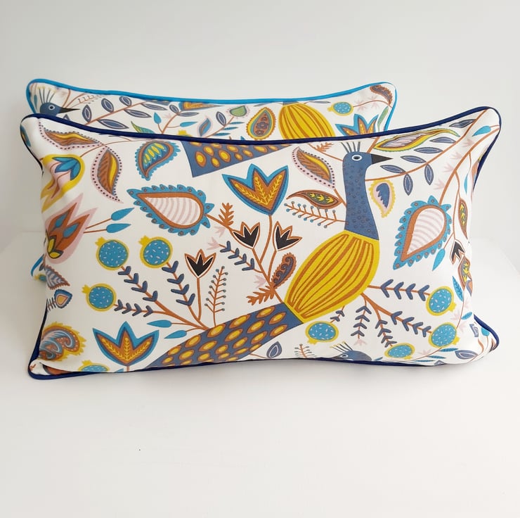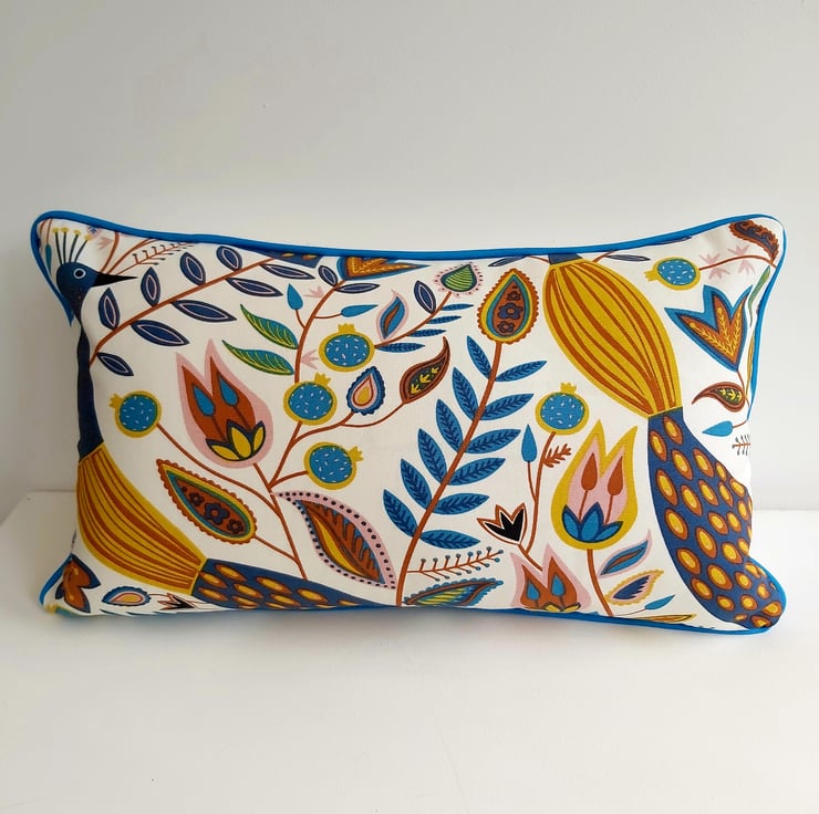 Colourful peacocks cushion with lovely soft polyester inner, cream back with central zip and blue or turquoise piping.