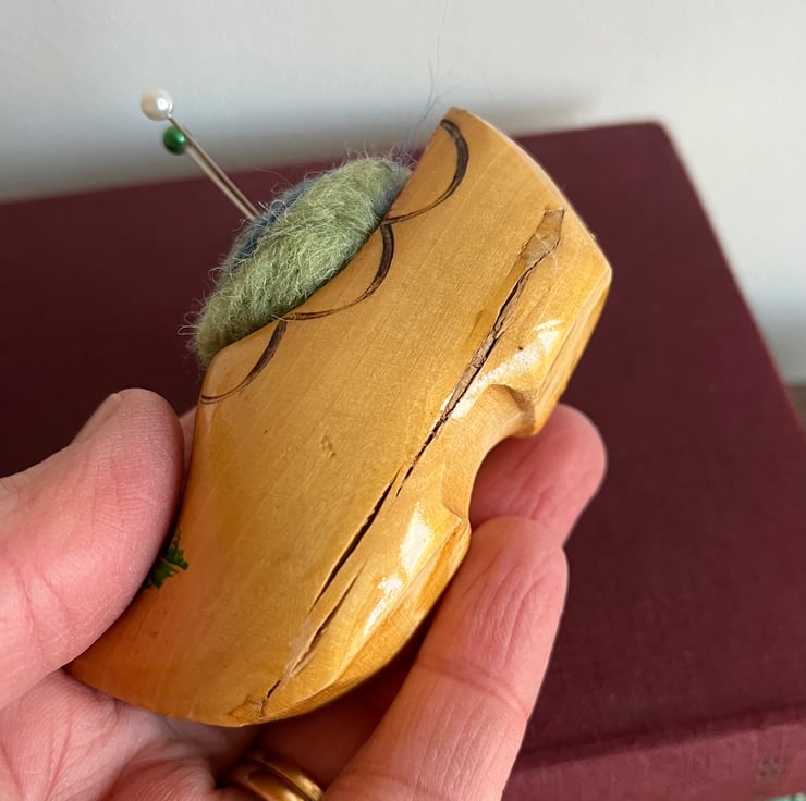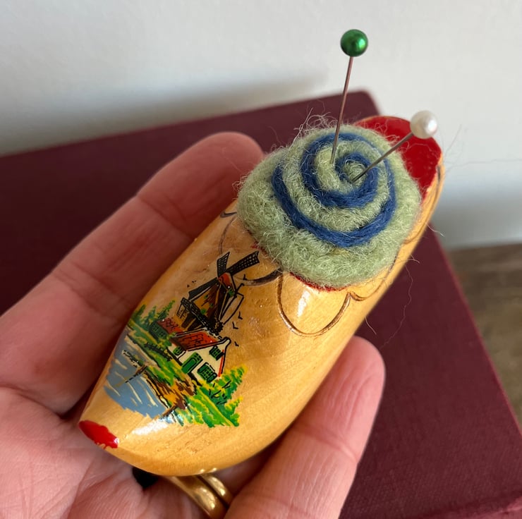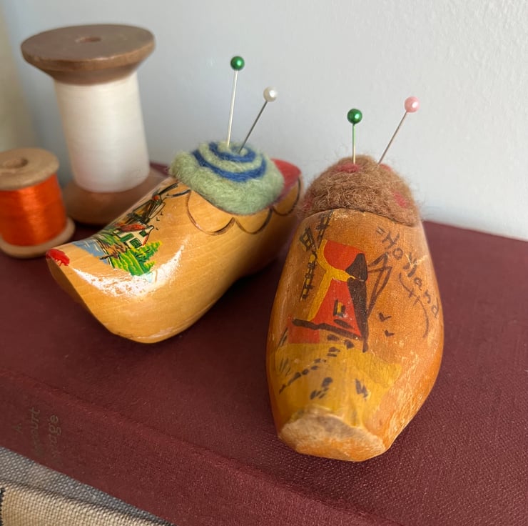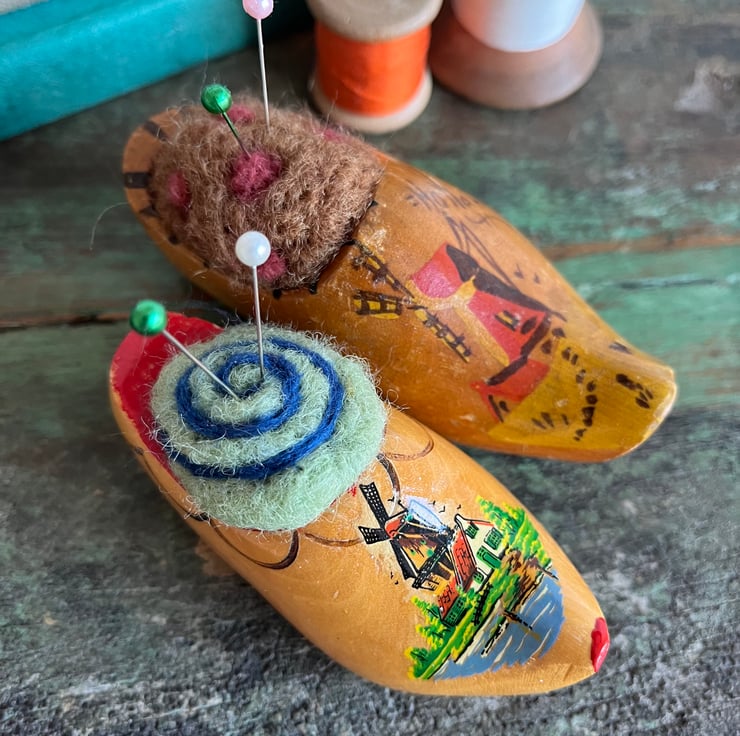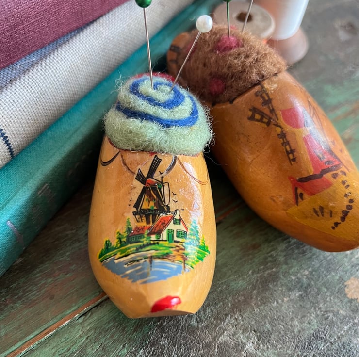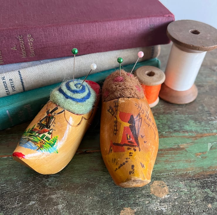 Cute little pair of small pincushions - both made from old souvenir wooden clogs. One has a hand painted windmill and the other is a printed picture, also of a windmill.