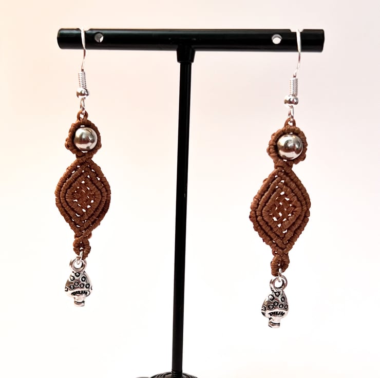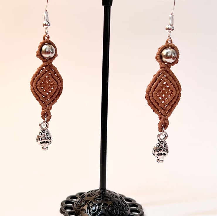 Macrame design is made by waxed thread and embellished with little mushroom.