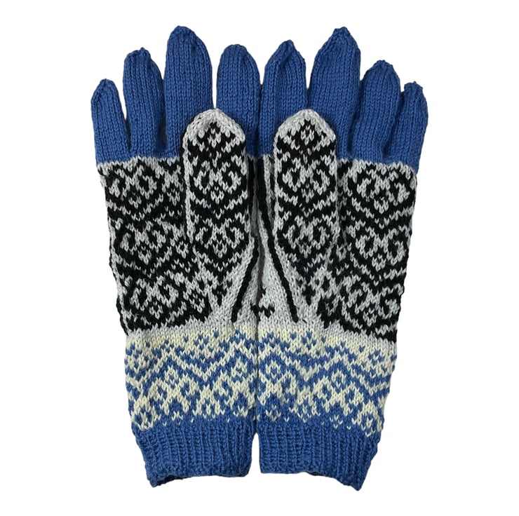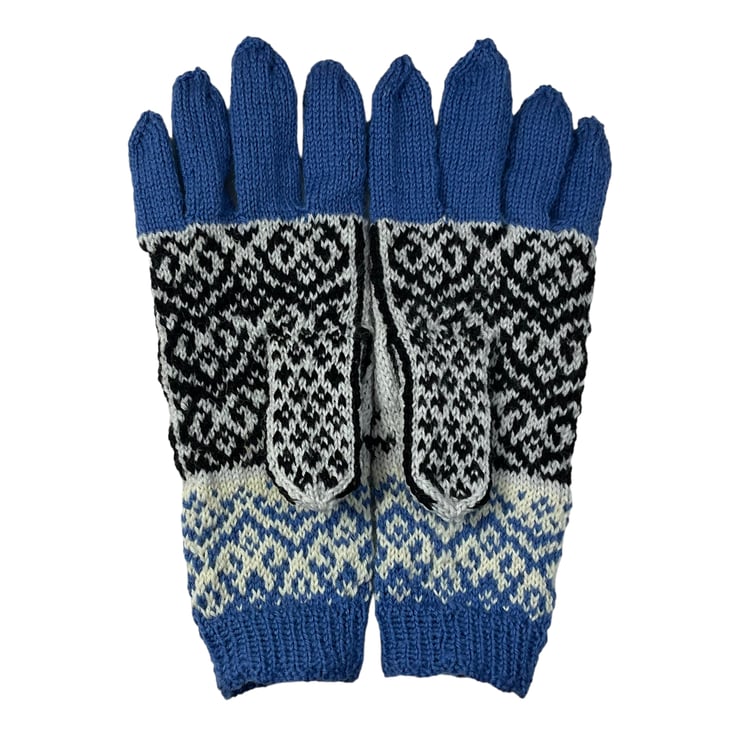 The stranding continues on the palm of the hands and thumbs, which have a heart shaped selbu style pattern in the black and grey. The thumb also continues this pattern.