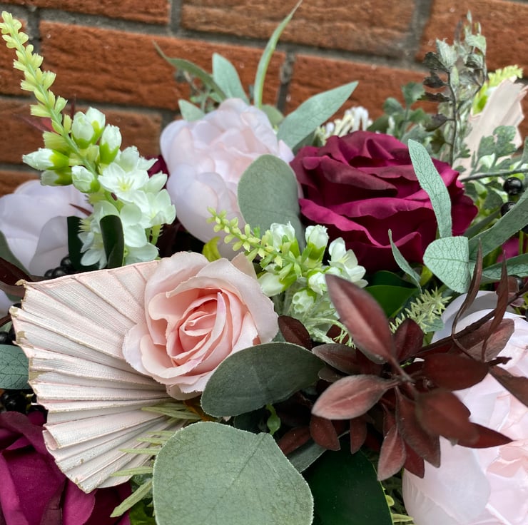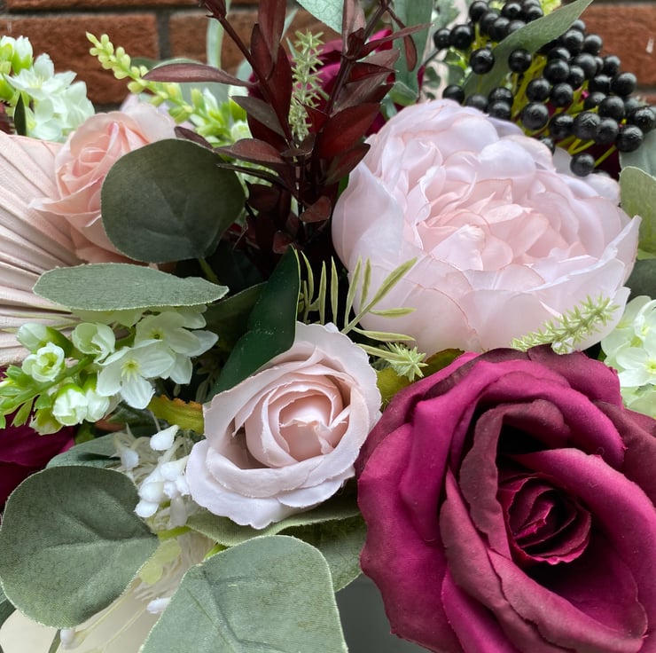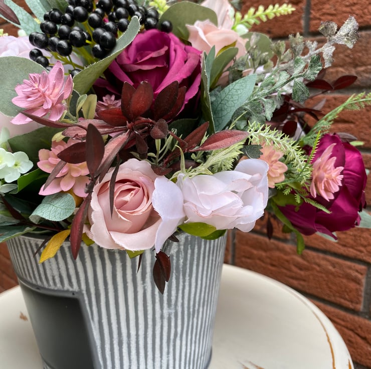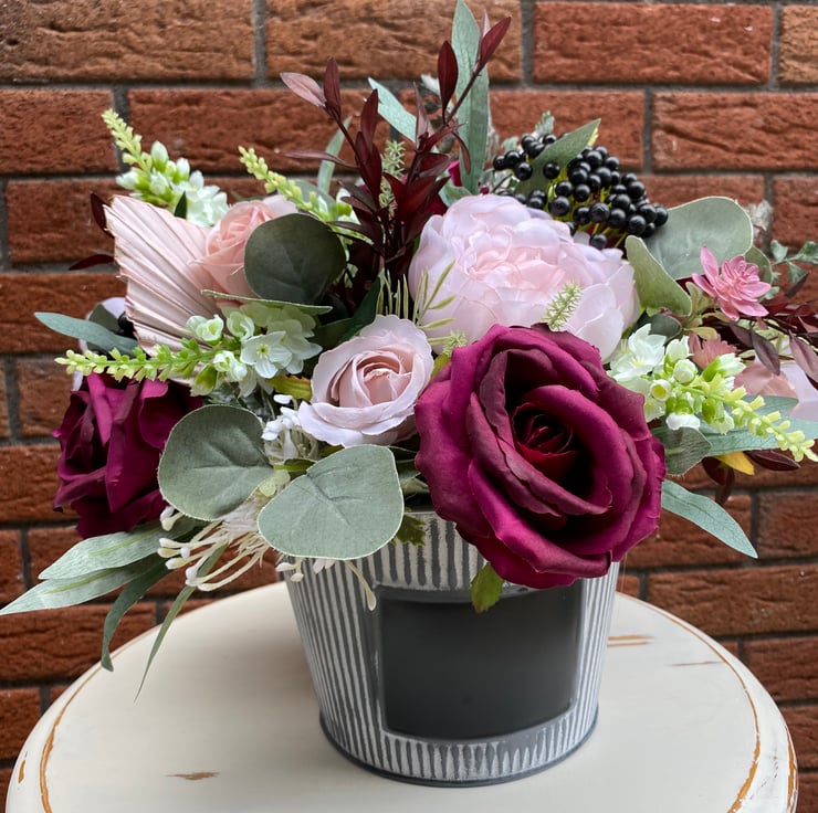 A beautiful collection of silk flowers arranged in a metal bucket with a black square on the front. Composed of different shades of pink and ivory roses, peony roses surrounded by queen anne lace, gypsophila and eucalyptus.