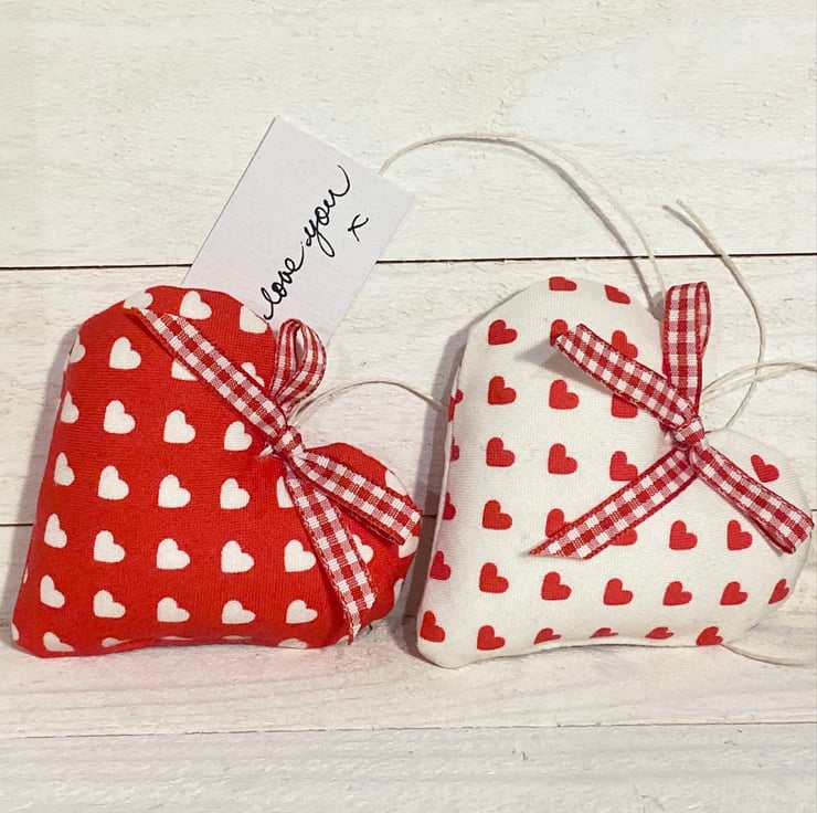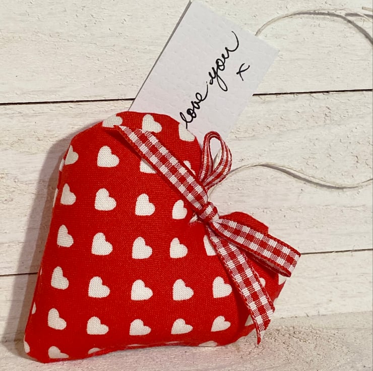 An abundance of love hearts on this charming heart decoration. Tiny white hearts on a red background, front and back, and finished with a country-style red and white gingham ribbon bow. Filled with fragrant Hampshire lavender.