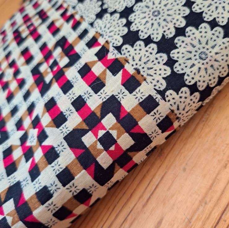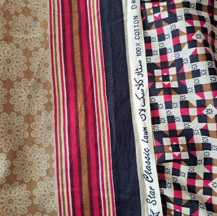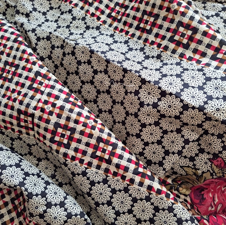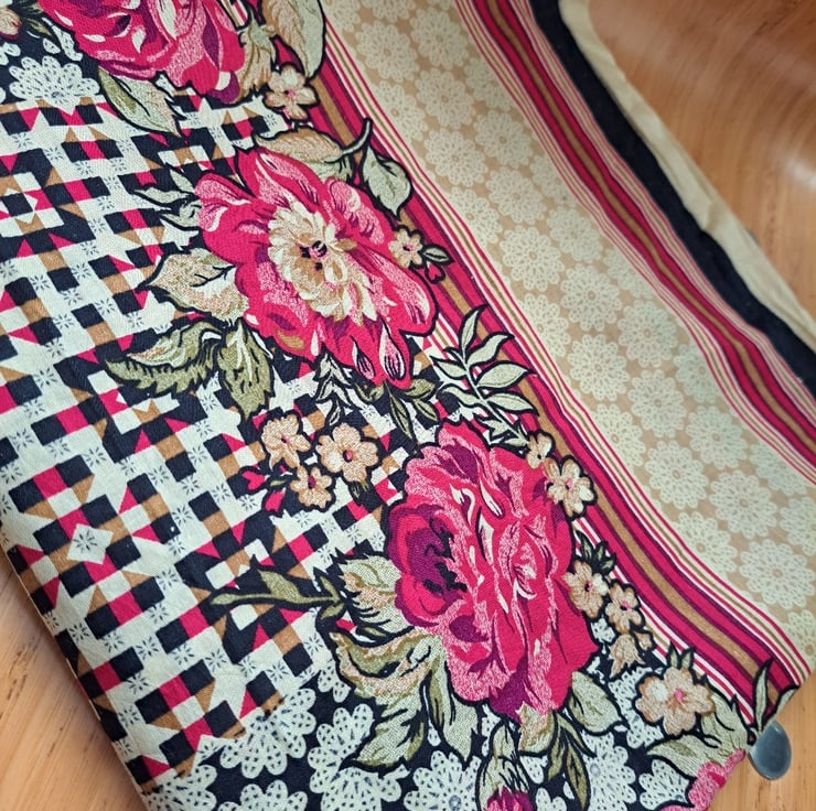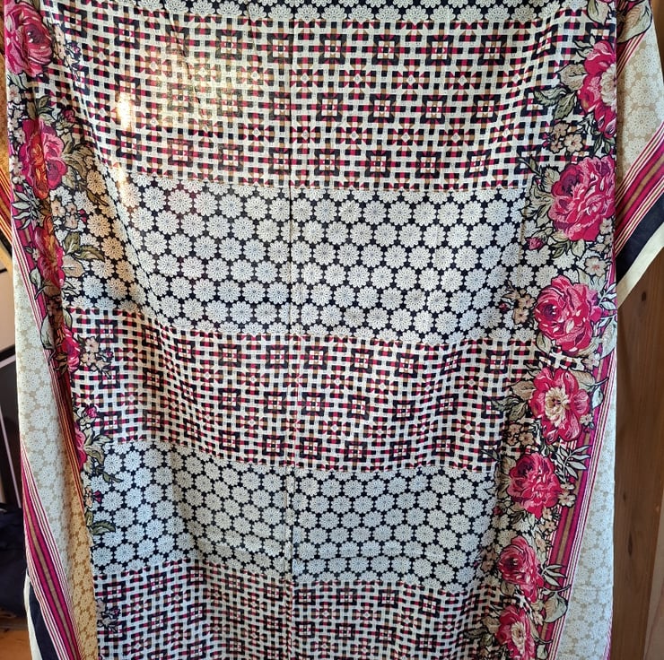 This is a rather special thing - a piece of fine cotton lawn 2.5 metres long and a metre wide with a printed mirrored border of stripes and roses. It's in perfect, as-new condition and would make a very striking summer stole or kimono jacket perhaps.