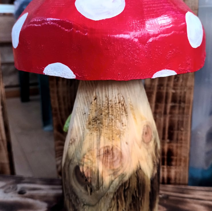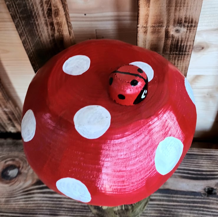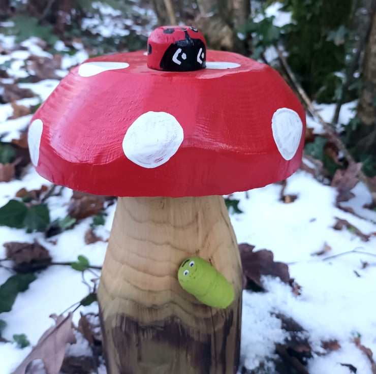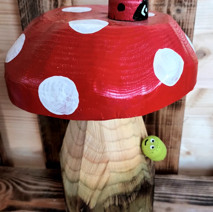 It is made of two pieces of wood securely attached together and has been chainsaw carved then sanded. The spotty top is decorated with weatherproof red and white paints. The ladybird and green caterpillar are also handmade..