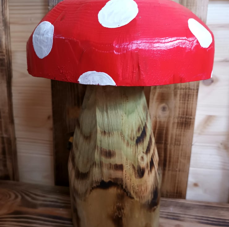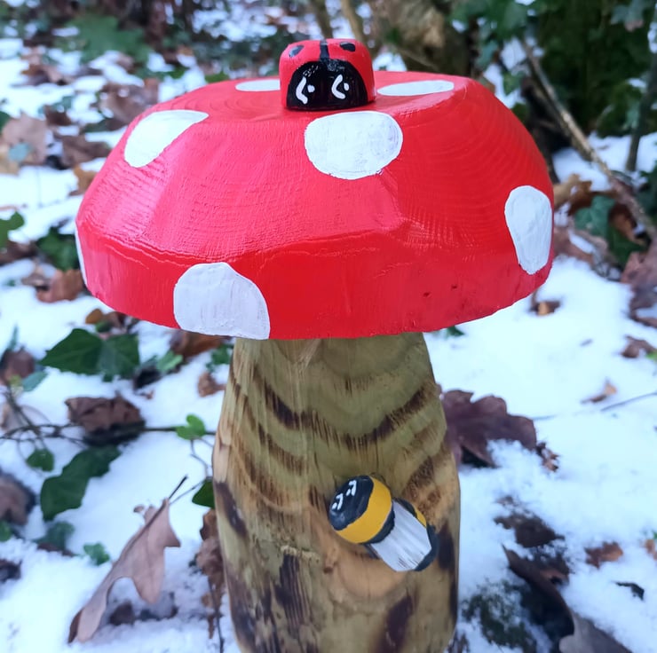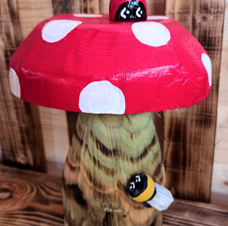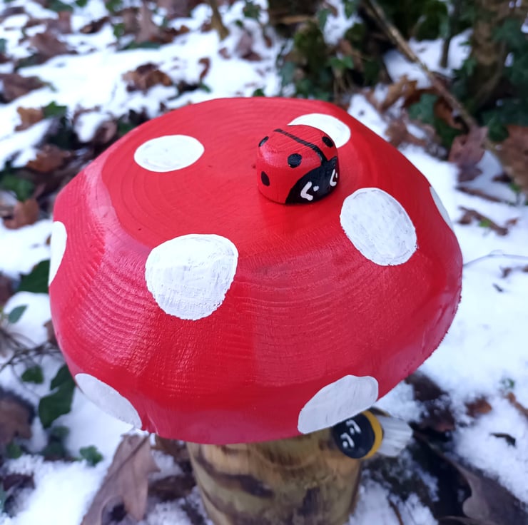 It is made of two pieces of wood securely attached together and has been chainsaw carved then sanded. The spotty top is decorated with weatherproof red and white paints. The ladybird and little bee are also handmade.