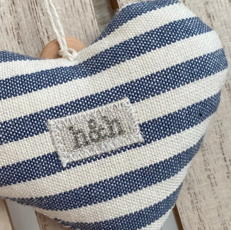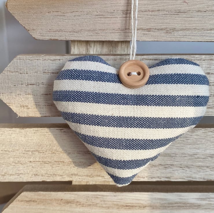 A beautifully shaped airforce blue striped heart decoration, plump with Hampshire lavender. The fabric is a superior quality woven cotton with a lovely weighty feel. Each heart is hand finished with a little round wooden button and with natural hemp twine hanging ties.