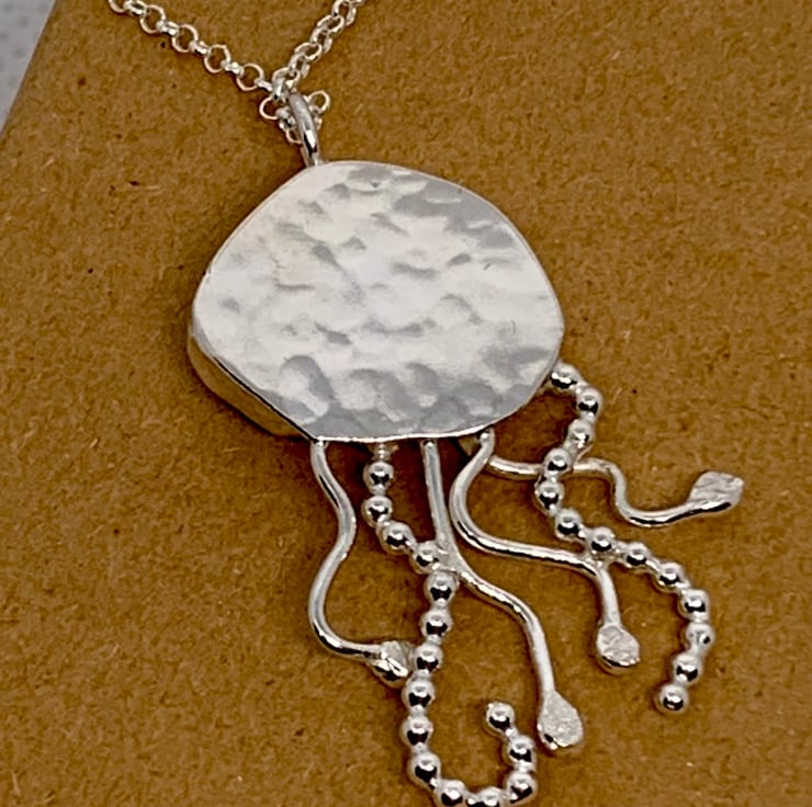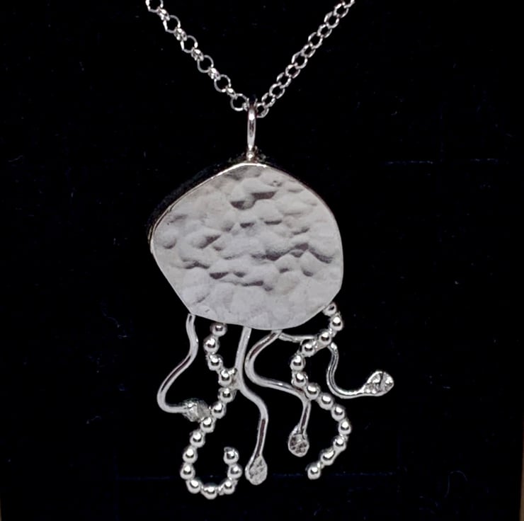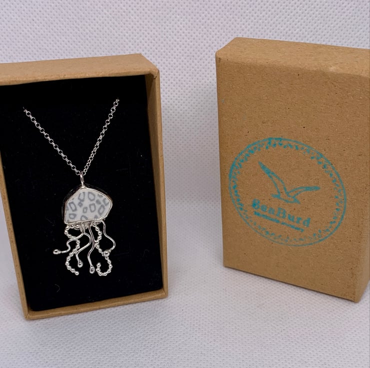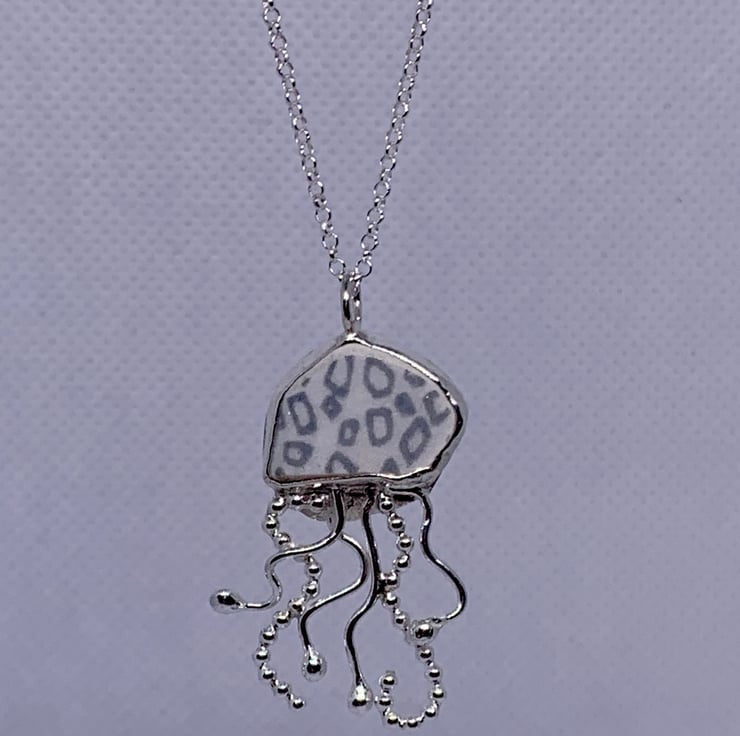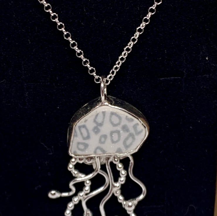 This beautiful piece of sea pottery was found along the UK's South West coastline and has been set in a fine silver bezel (.999) and using recycled (ecosilver) sterling silver wire (.925) to create a beautifully unique Jelly fish pendant. The back of the pendant has been hammer textured. This piece has not been hallmarked.