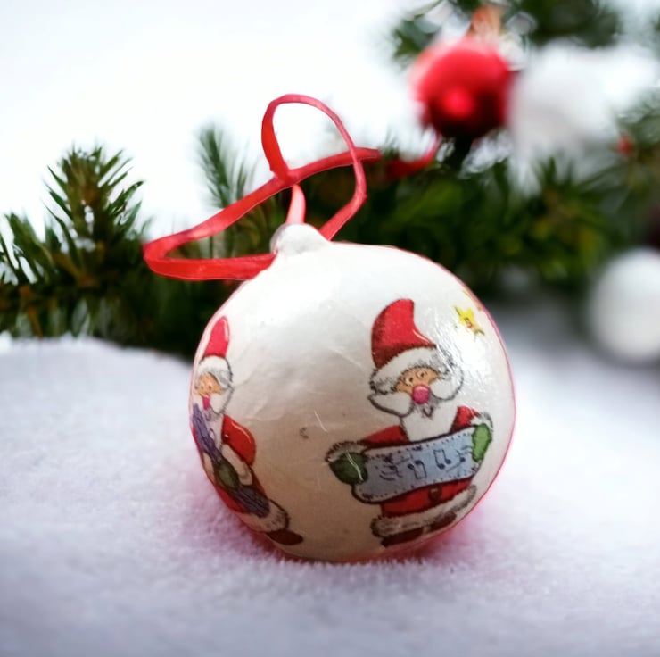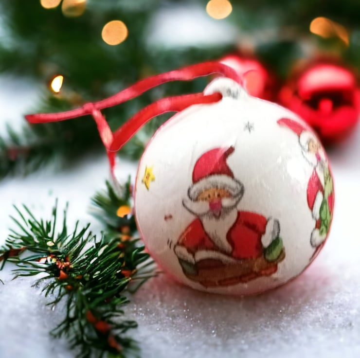 This Santa Claus ceramic bauble has been hand painted, decoupaged, finished with multiple coats of clear varnish and a coordinating ribbon hanger.