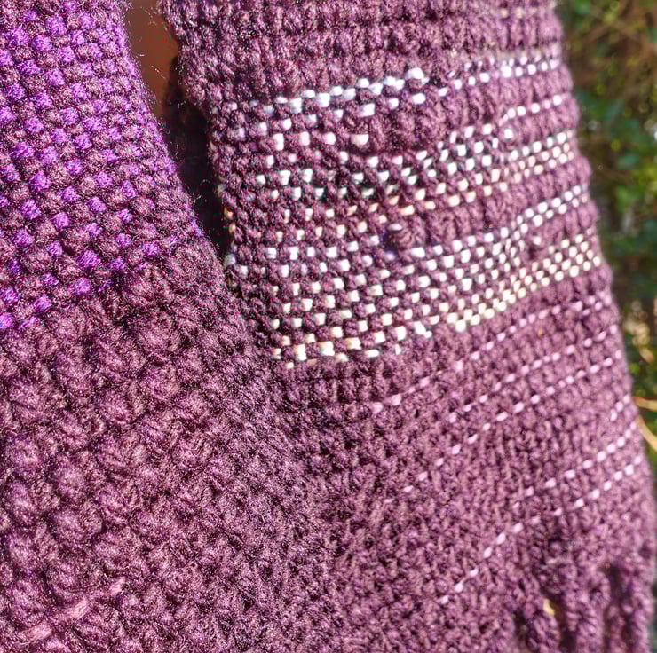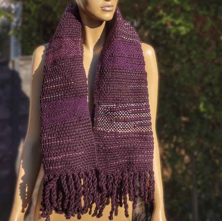 I used my 32" Ashford rigid heddle loom to create this scarf using a chunky deep purple wool as the base.