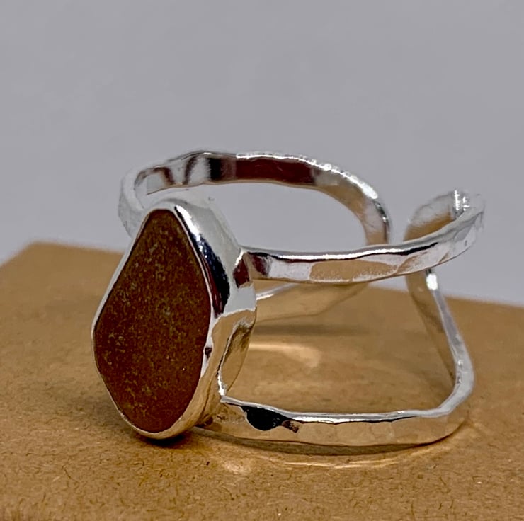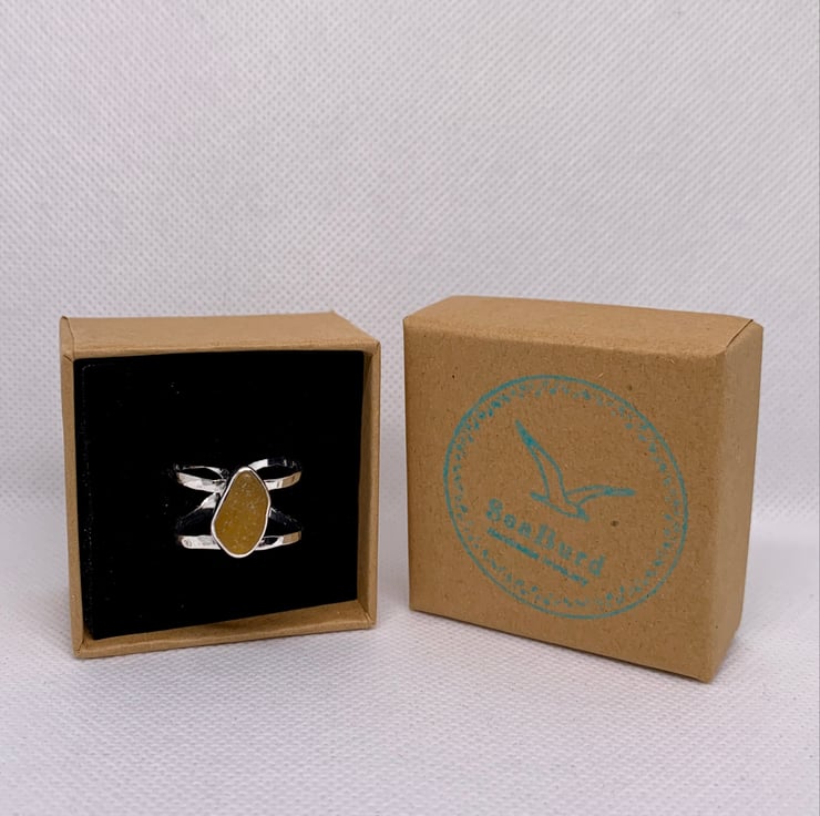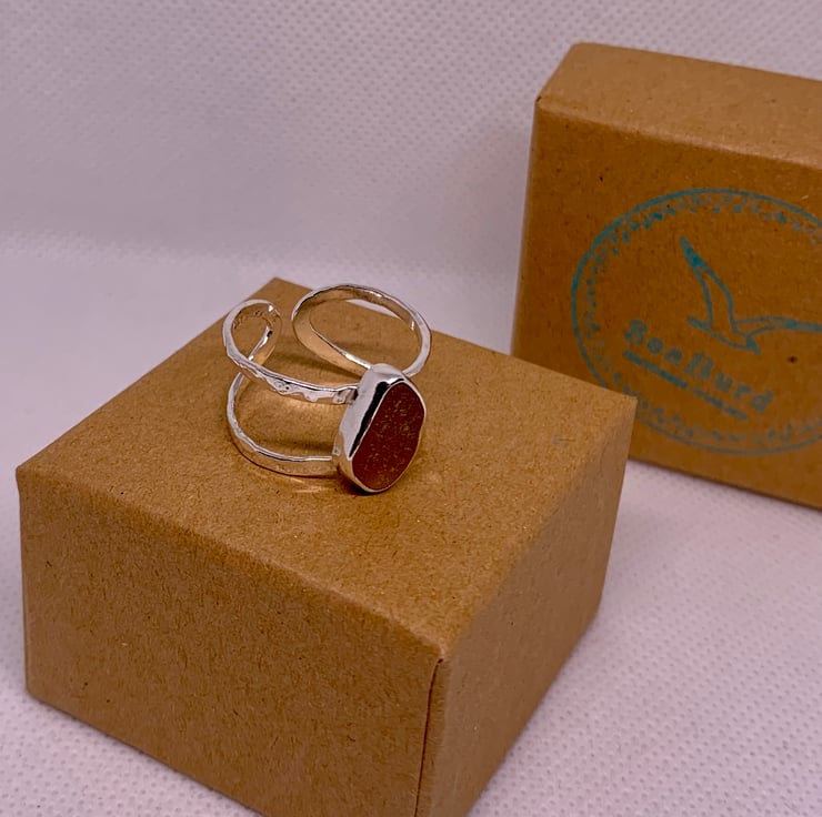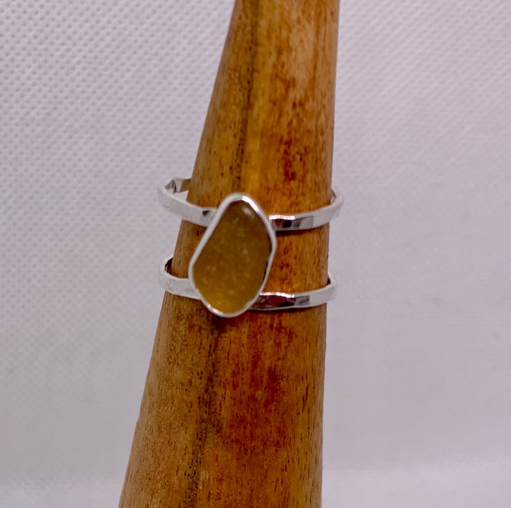 This beautiful piece of honey amber sea glass was found along the UK's South West coastline and has been set in a fine silver bezel (.999) with a double band of recycled (ecosilver) sterling silver (.925) 1.5mm round wire ring., which has been hammer textured. This ring has not been hallmarked.