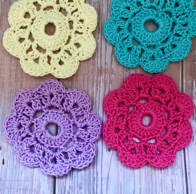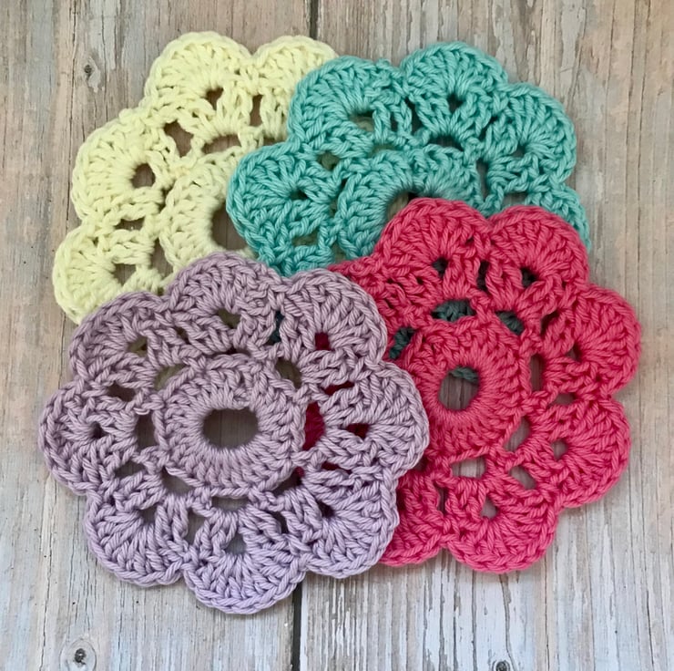 Set of handmade crochet coasters in cheery pastel colours and a flower motif. Made with 100% cotton.