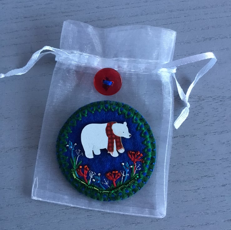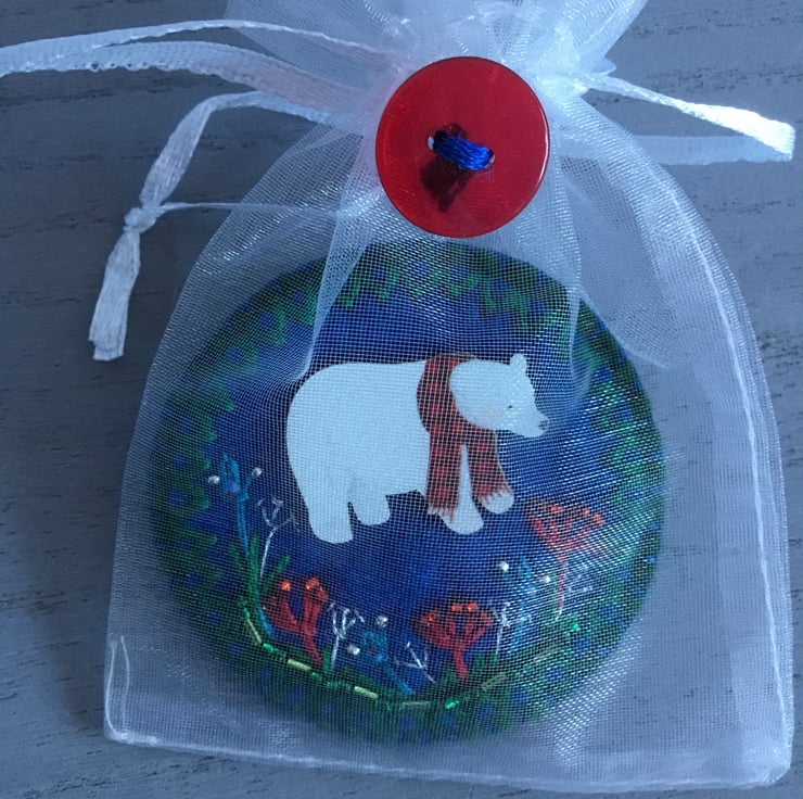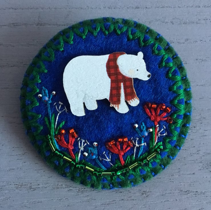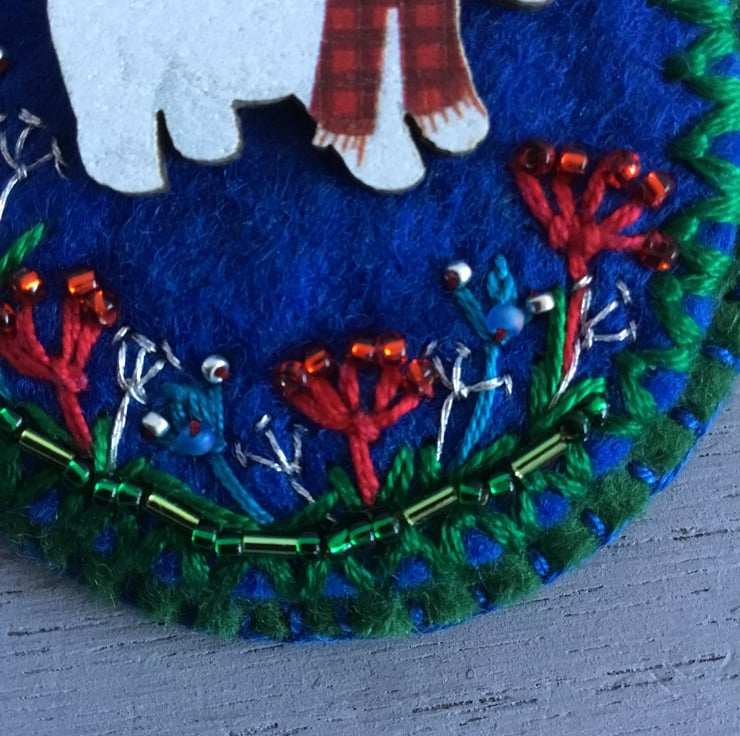 This Hand Embroidered Winter Brooch has a lovely Winter scene in Winter colours of white, green, red, and silver. A wooden polar bear stands in a border of Winter flowers, hand embroidered in in red, blue and silver embroidery threads, decorated with red, blue and green seed and bugle beads…….that twinkle in the Winter light….