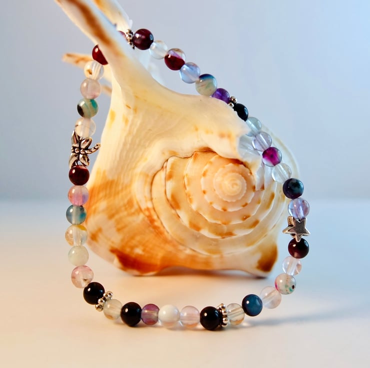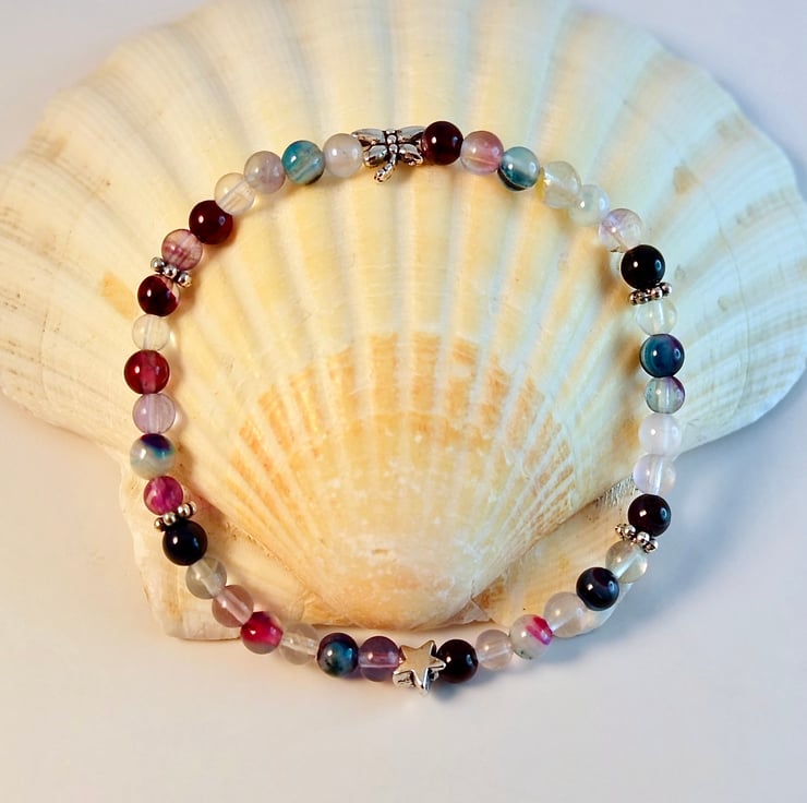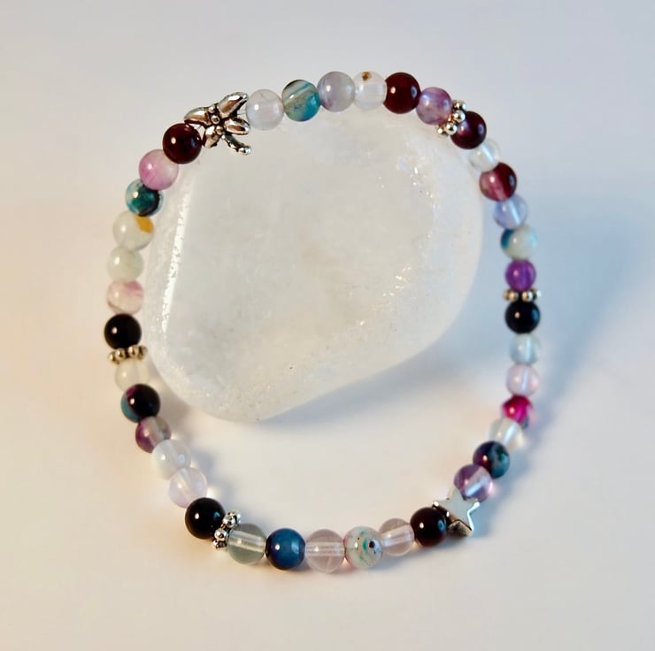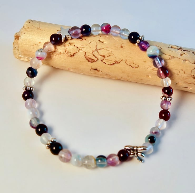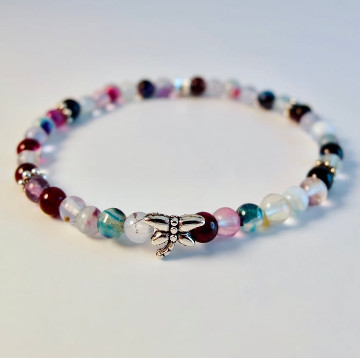 Dainty stretch bracelet made from mixed 4mm agate and fluorite beads embellished with Tibetan-style, silver daisy beads, a star and a dragonfly - all nickel and lead free.