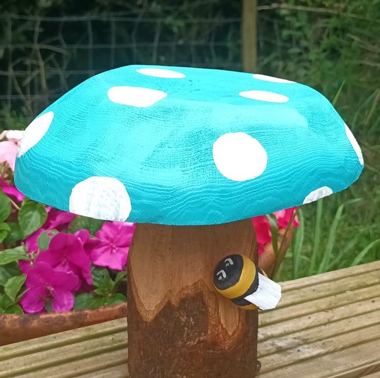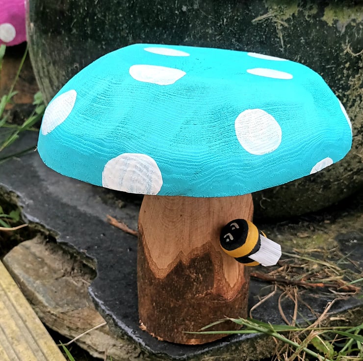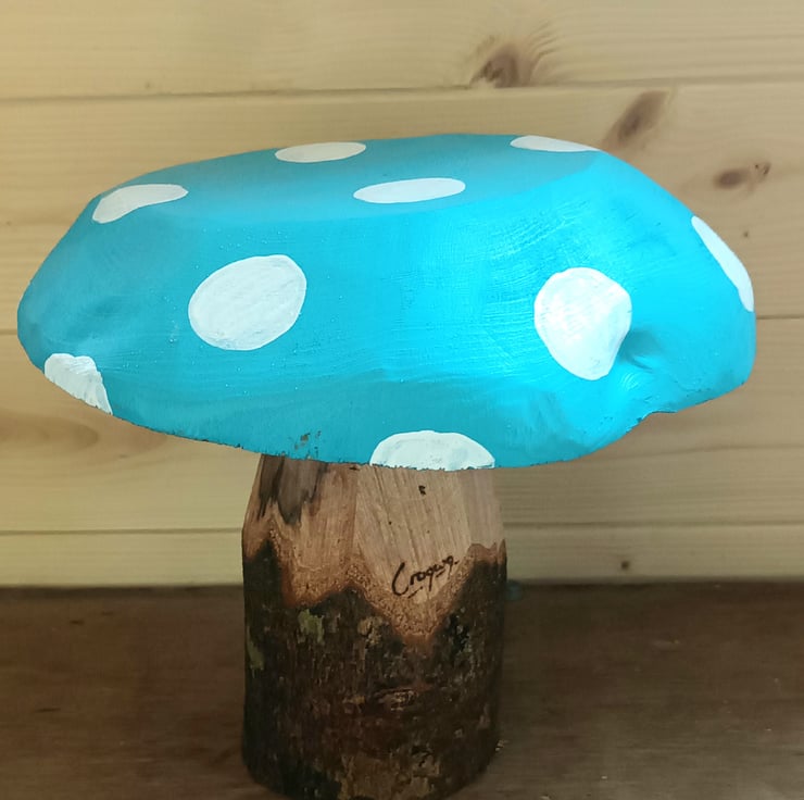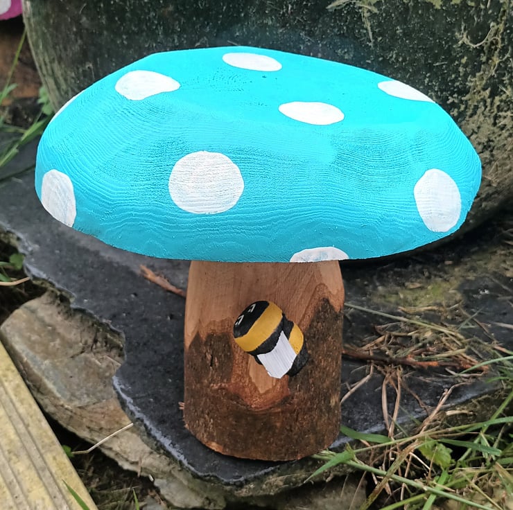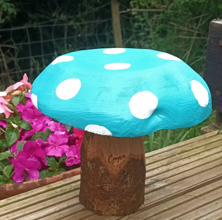 This blue spotty toadstool is handmade and makes a lovely garden ornament.