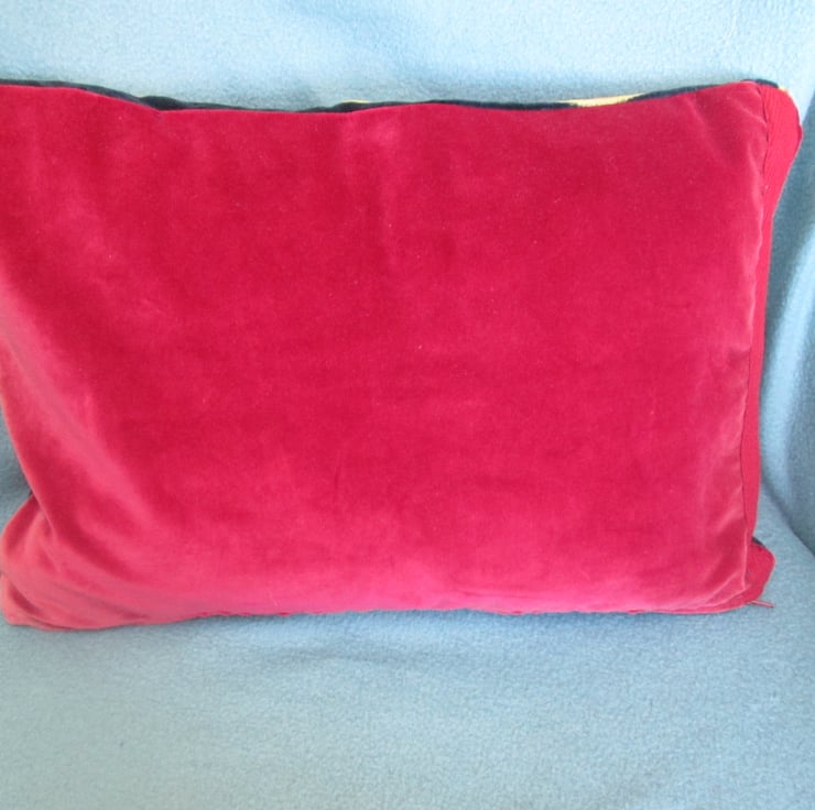 The front is navy blue background with a floral design in reds and pinks, with a border pattern in cream and pinks. Reverse side is a plain pinky red to match the flowers and the cushion has a full zip fastening. The inner supplied is hollowfibre covered in fuchsia pink cotton fabric.